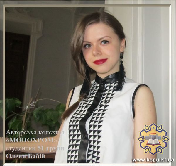 Колекція одягу О. Бабій «Монохром» витримана у чорно-білій естетиці, створена з незвичних форм та графічних елементів. У колекції поєднані біла легка сорочкова тканина з чорною штучною шкірою, образам надає завершеності оздоблення тканиною із геометричним принтом та біжутерія ручної роботи.