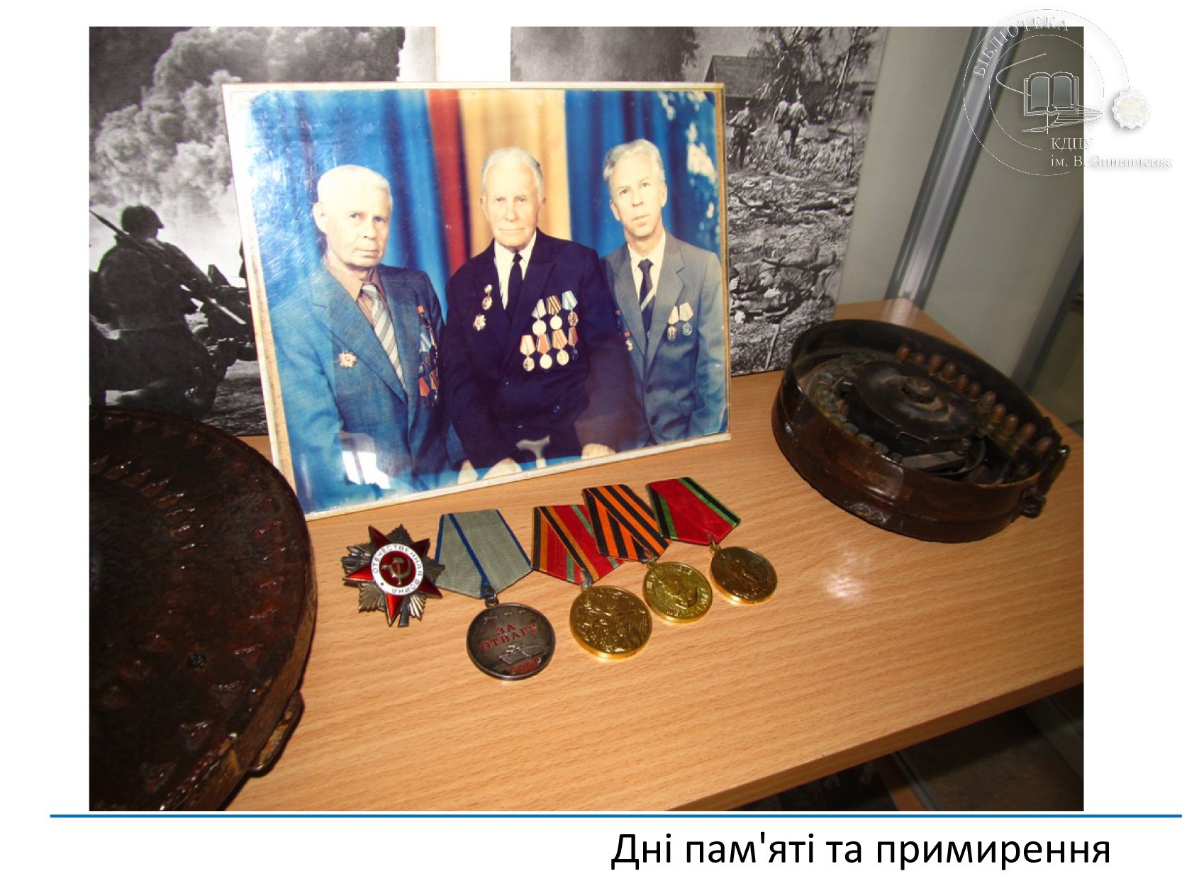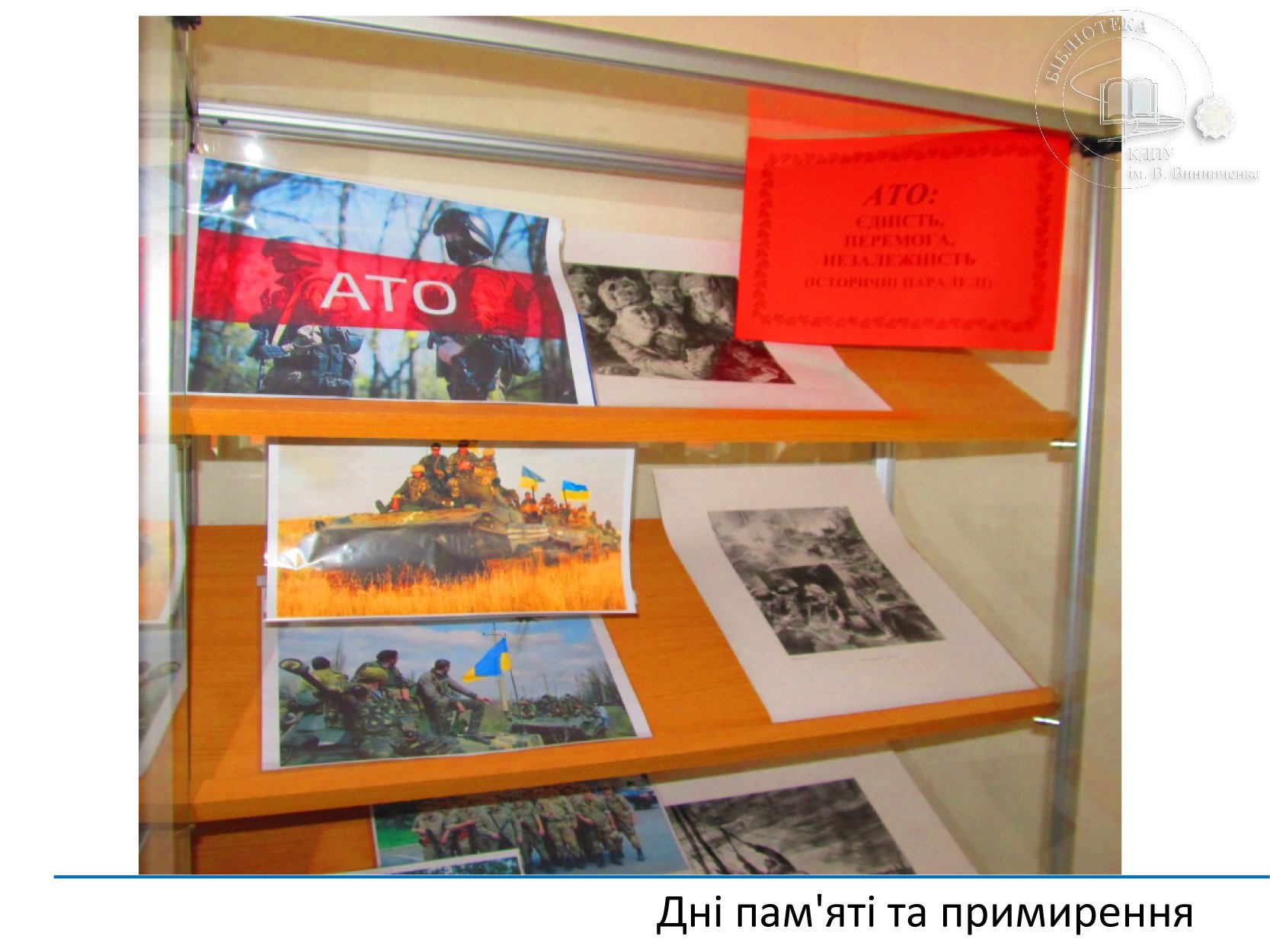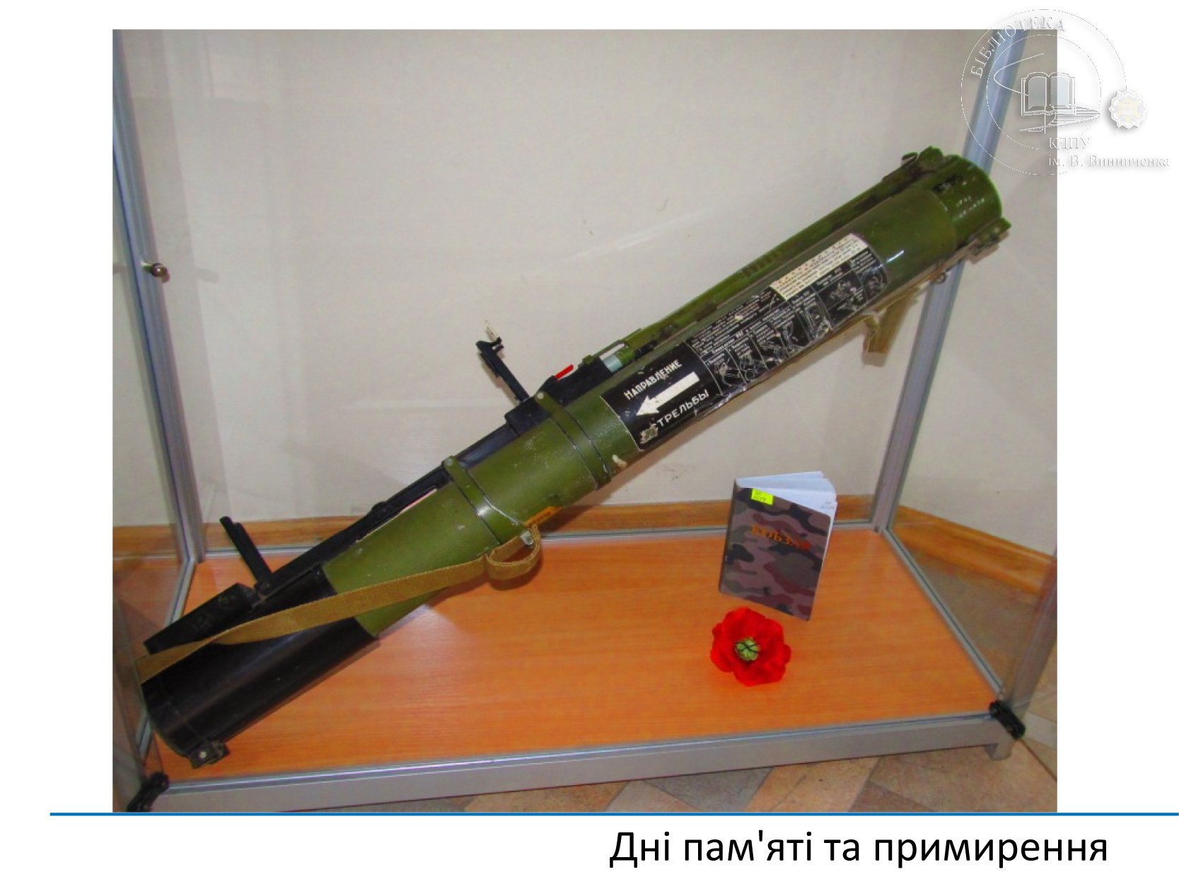 Завітавши на виставки, читач не залишиться байдужим, адже кожна книга несе в собі пам’ять про загиблих, дух патріотизму, нескореність і перемогу, а також пропонуються увазі предмети військового озброєння Другої світової війни та зони АТО.