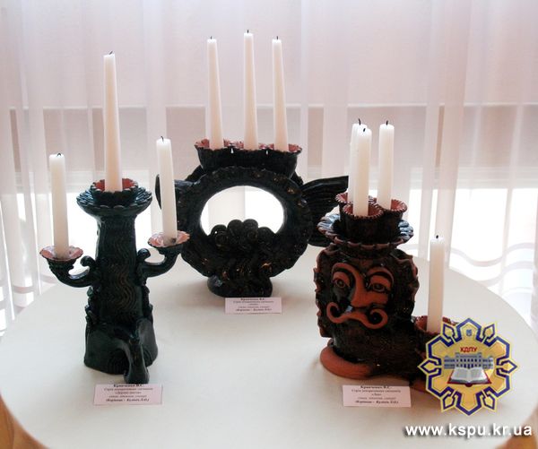 Опановували нелегке мистецтво кераміки Кравченко В.С. - серія декоративних свічників «Дерево життя», «Риба», «Лев» (глина, ліплення, глазурі) та Виштикайло А.В. - декоративна композиція «Маки» (кераміка, солі, оксиди, глазурі) завдяки Кулініч Л.О. - старшого викладача кафедри хореографічних дисциплін образотворчого мистецтва та дизайну.