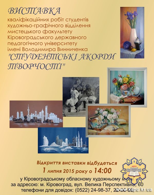 1 липня 2015 року в Кіровоградському обласному художньому музеї відкрито виставку кваліфікаційних робіт студентів художньо-графічного відділення мистецького факультету Кіровоградського державного педагогічного університету імені Володимира Винниченка «Студентські акорди творчості».