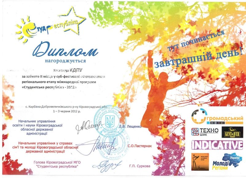 Збірна КДПУ ім. В. Винниченка показала себе гідним суперником в змаганні за честь називатися кращим серед вишів області. Про це переконливо свідчить перемога в субфестах та зайняті призові місця. З цим можна привітати студентів в таких номінаціях:
