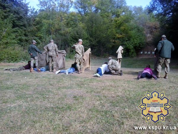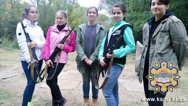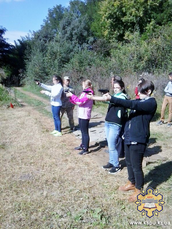 На військовому полігоні у с. Богданівці нас розділили на групи по 5 чоловік. Спочатки ми мали можливість стріляти з АКС автомату Калашникова зі складним прикладом, а потім з МС пістолета Макарова. Було дуже незвичайне відчуття коли ми вперше стріляли зі справжньої зброї.