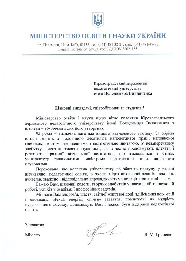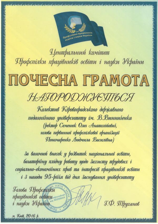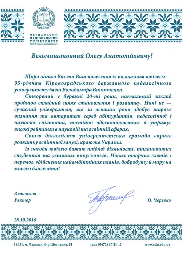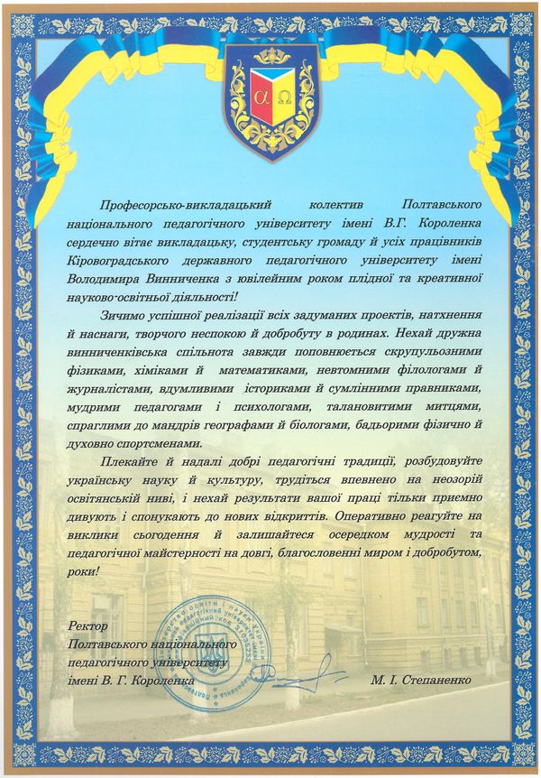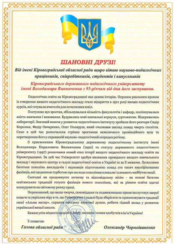 А потім розпочалася частина урочистостей. Звернувся зі сцени ректор КДПУ ім. В. Винниченка Олег Анатолійович Семенюк та наголосив, на тому, що університет — це не стіни і будівля, а люди, які там навчаються та працюють. Після слів розпочалася офіцйна частина нагородження кращих. Розпочав вітальне слово та привітав подарунком Народний депутат України Олександр Володимирович Горбунов та нагородив від Міністерства освіти і науки Україн: нагрудними знаками «Відмінник освіти і науки України» та «За наукові та освітні досягнення», Грамотою Міністерства освіти і науки України та Подяками Міністерства освіти і науки України. Почесними грамотами Національної академії педагогічних наук України, Кіровоградської обласної державної адміністрації та обласної ради, Грамотами міської ради, ціннимими подарунками від міської Ради, Грамотою міської ради та виконавчого комітету, нагороджували Олег Анатолійович Семенюк — ректор КДПУ ім. В. Винниченка, Сергій Анатолійович Кузьменко — голова ОДА, Колос Вадим Іванович — заступник директора департаменту культури, туризму та культурної спадщини Кіровоградської ОДА, Скалько Світлана Леонідівна — голова обласного комітету профспілки працівників освіти і науки Кіровоградської області та Шатна Лідія Францівна - заступник начальника управління освіти, науки, молоді та спорту облдержадміністрації.