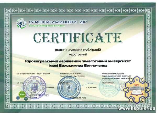 Вагомим здобутком усіх викладачів, котрі публікують результати своєї наукової діяльності, став СЕРТИФІКАТ ЯКОСТІ НАУКОВИХ ПУБЛІКАЦІЙ, підставою для видачі якого стали показники наукометричної бази SciVerce Scopus.