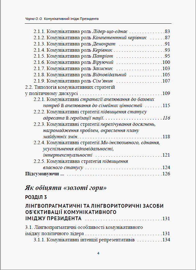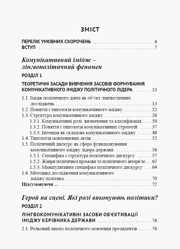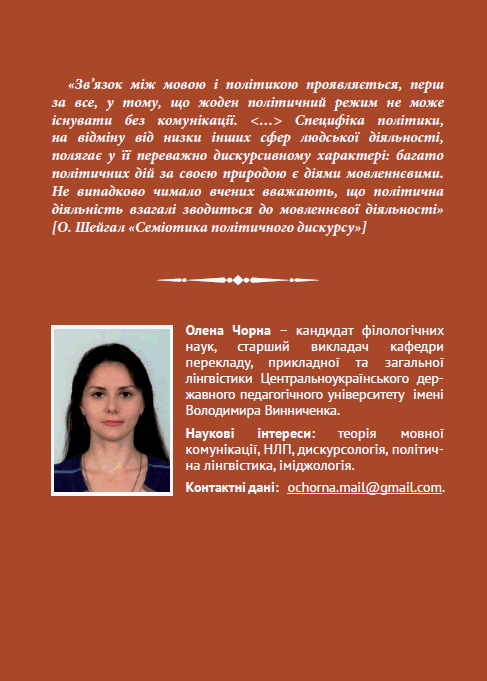 Монографію присвячено дослідженню феномену комунікативного іміджу глави держави. На матеріалі новітнього політичного дискурсу (2000–2016 рр.) проаналізовано комунікативний імідж Президентів України, США та Росії, визначено домінантні комунікативні ролі, стратегії та інтенції його побудови; схарактеризовано спільні та відмінні риси творення іміджу лідера країни на матеріалі трьох мов; розглянуто трансформацію комунікативного іміджу українського Перезидента протягом цього періоду.