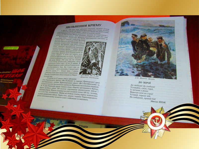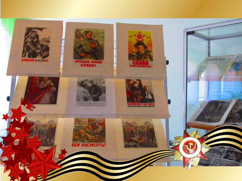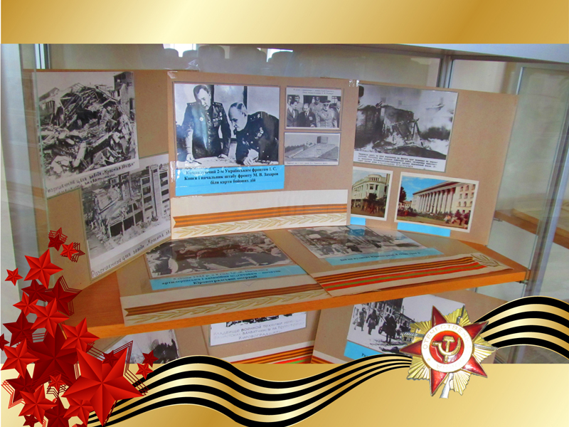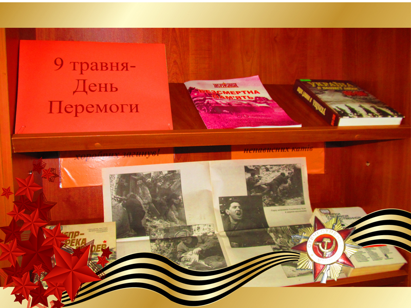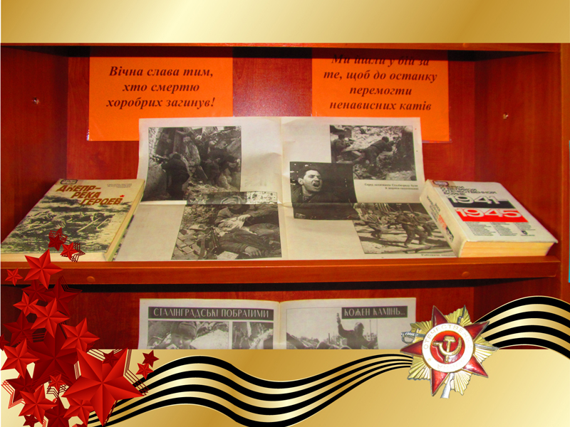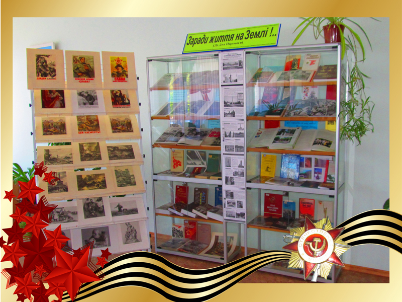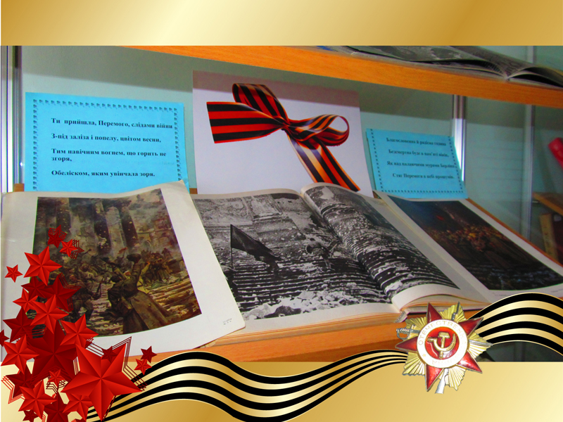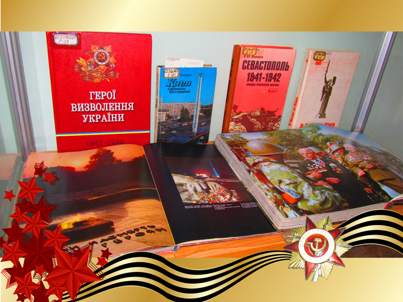 Виставки представлені до Дня Перемоги - своєрідний вінок шани й любові до фронтовиків, які незабутнього 1945 року піднесли над світом прапор великої Перемоги. В жорстокому двобої з гітлерівськими поневолювачами воїни-визволителі відстояли свободу і незалежність Батьківщини, врятували світову цивілізацію від фашистського варварства.