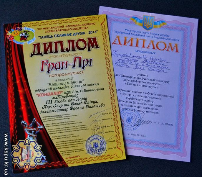 18-20 березня 2016 року відбувся XIV Міжнародний фестиваль-конкурс хореографічного мистецтва «Танець скликає друзів». Близько 50 учасників – представники України, Польші, Білорусії, Португалії, а перемога – Гран-Прі – за народним ансамблем бального танцю «Конвалія» КДПУ ім. В. Винниченка (ІІІ вікова категорія; керівники: Ігор та Олена Спінул, балетмейстер: Оксана Балашова). Крім цієї перемоги, ансамбль став дипломантом за популяризацію кращих здобутків національної культури і духовної спадщини українського народу, піднесення їх на сучасний рівень та значні творчі досягнення у хореографічному мистецтві.