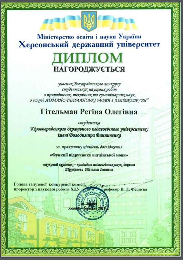 Деканат факультету іноземних мов щиро вітає студентку 6 курсу Гітельман Регіну Олегівну (Напрям підготовки: 8.02030302 Мова і література (англійська). Спеціалізація: Німецька мова) та її наукового керівника кандидата педагогічних наук, доцента кафедри германської філології Труханову Тетяну Іванівну з перемогою у Всеукраїнському конкурсі студентських наукових робіт в галузі «Романо-германські мови і література», який проходив у Херсонському державному університеті, та нагородженням дипломом у номінації «За практичну цінність дослідження» на тему «Функції підручника англійської мови».