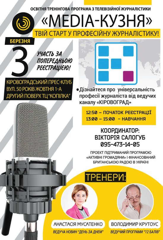 Освітня тренінгові програма з телевізійної журналістики «Media-кузня» відкриває ще більше можливостей для учасників. Тренінг, який було проведено на базі КДПУ ім. В. Винниченка від кореспондента ТСН Івана Гребенюка має продовження, але вже за межами Кіровоградщини. У квітні усі учасники відвідають студію телеканалу «1+1» та побачать на власні очі як створюється всеукраїнський інформаційний простір.