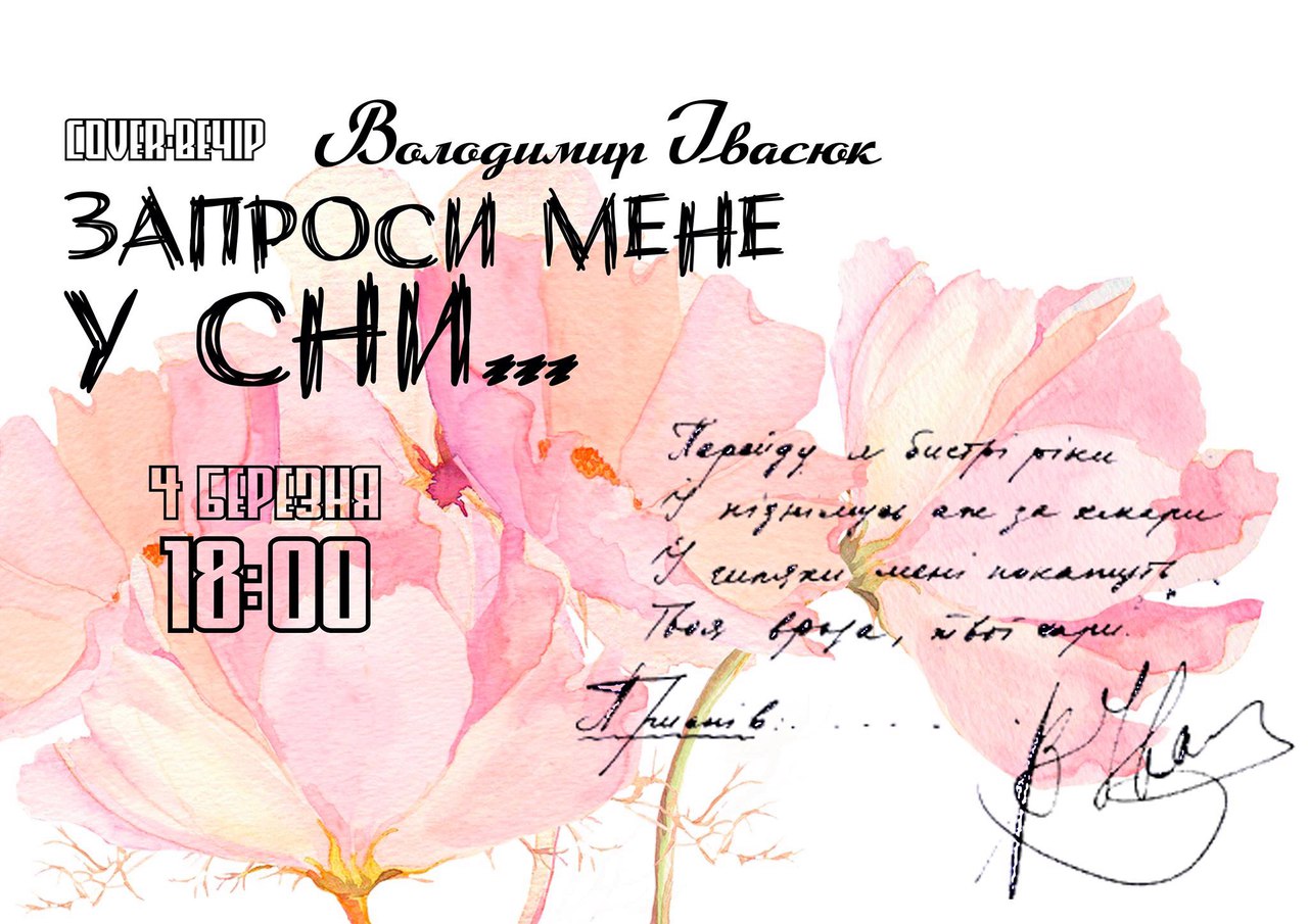 З нагоди дня народження відомого композитора та співака Володимира Івасюка 4 березня, у кав’ярні «Мокко» відбудеться сover-вечір «Запроси мене у сни». Початок о 18 годині. Вхід вільний.