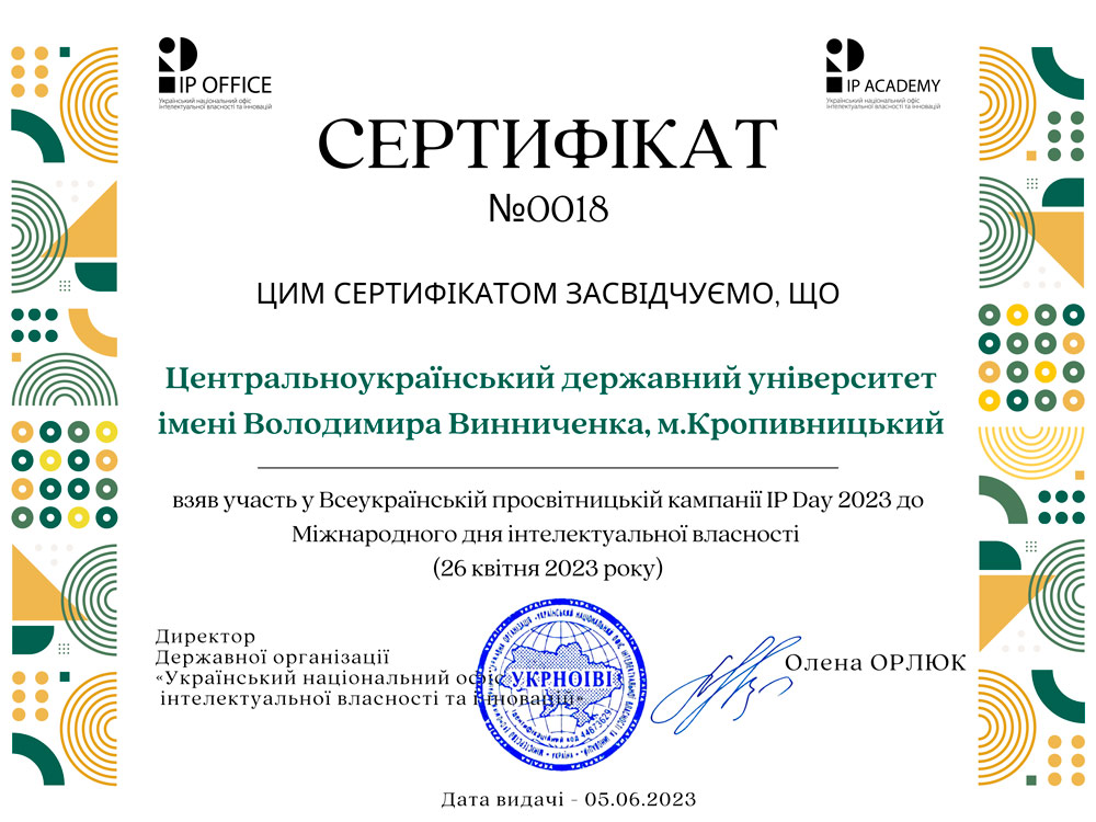 За результатами цієї роботи днями ЦДУ отримав сертифікат від УКРНОІВІ - Українського національного офісу інтелектуальної власності та інновацій та Академії інтелектуальної власності.