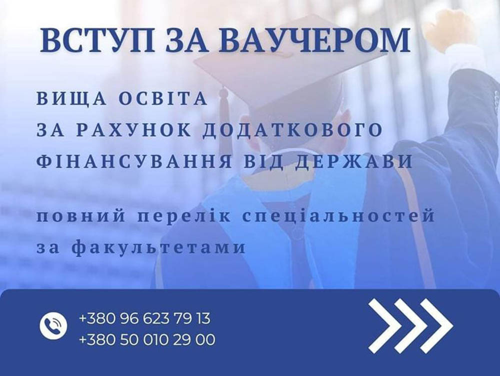 За сприяння Державної служби зайнятості вступники окремих категорій, які планують здобути ступінь бакалавра або магістра на основі раніше здобутого ступеня вищої освіти, можуть одноразово отримати Ваучер на підготовку або перепідготовку за іншою спеціальністю, спеціалізацією або на вищому рівні освіти.