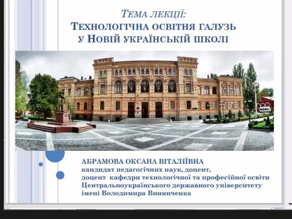 4 квітня 2023 року доцентка кафедри технологічної та професійної освіти Центральноукраїнського державного університету імені Володимира Винниченка, співрозробниця Державного стандарту базової середньої освіти (2020), членкиня авторського колективу Модельної програми для 5-6 класів за Держстандартом НУШ Абрамова Оксана Віталіївна провела гостьову лекцію «Технологічна освітня галузь у Новій українській школі» здобувачам вищої освіти, що навчаються за освітньо-професійною програмою «Середня освіта. Трудове навчання та технології, інформатика» у Хмельницькому національному університеті.