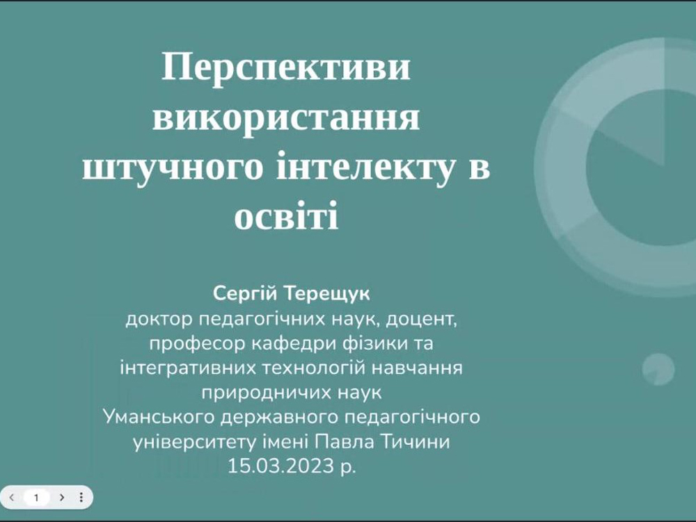 Доктор педагогічних наук, професор кафедри фізики та інтегративних технологій навчання природничих наук Уманського державного педагогічного університету імені Павла Тичини Терещук Сергій Іванович 05 квітня 2023 року провів на факультеті математики, природничих наук та технологій гостьову лекцію на актуальну тему «Перспективи використання штучного інтелекту в освіті».