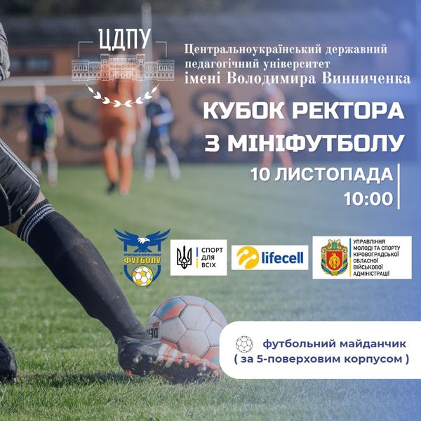 10 листопада за підтримки Управління молоді та спорту КОВА та обласної організації «Спорт для всіх», Кіровоградської обласної асоціації з футболу та Lifecell відбудеться Кубок ректора з мініфутболу серед студентів Центральноукраїнського державного педагогічного університету імені Володимира Винниченка!