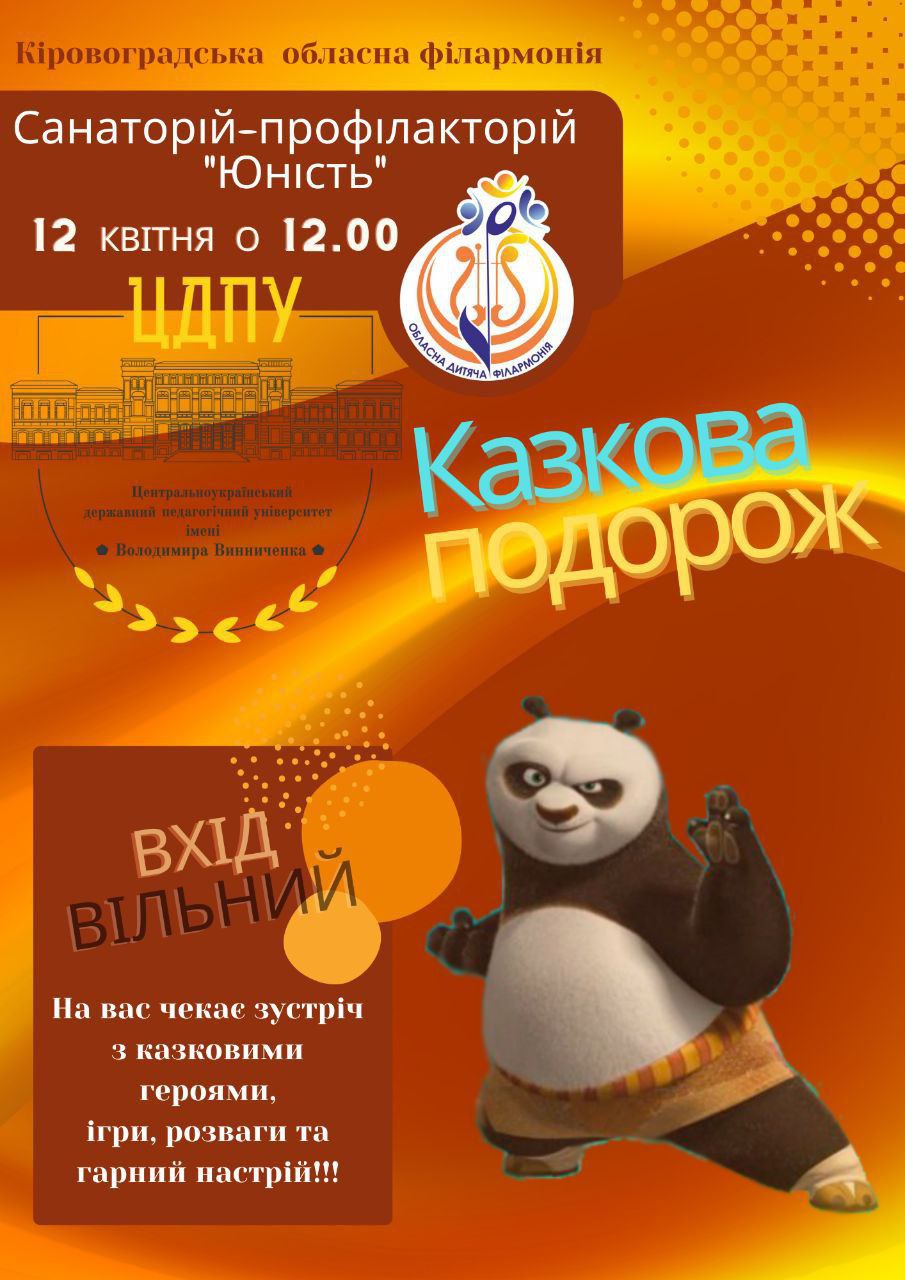 Центральноукраїнський державний педагогічний університет ім. В. Винниченка та Кіровоградська обласна філармонія запрошують на виставу «Казкова подорож», яка відбудеться 12 квітня о 12:00 у санаторії-профілакторії «Юність» (Студентський бульвар, 19). Вхід вільний.