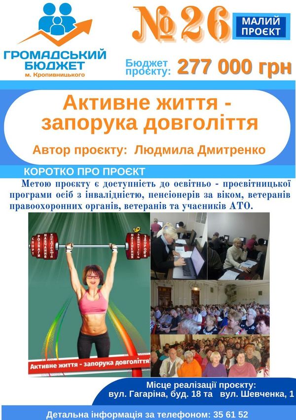 З 13 по 26 вересня 2021 року триватиме голосування за проєкти на конкурс «Громадський бюджет 2022». Запрошуємо усіх небайдужих мешканців міста Кропивницький підтримати ініціативу університету третього віку «НАТХНЕННЯ» — малий проєкт під номером №26.