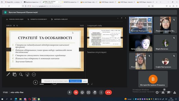 Першим представив свою доповідь Ярослав В’ячеславович Левицький, він розповів про особливості організації навчання обдарованих дітей та ознайомив присутніх із проєктною діяльністю, яку він, як вчитель математики, здійснює в КЗ «Ліцей «Науковий» Міської ради міста Кропивницького» в межах секції «Математика»:
