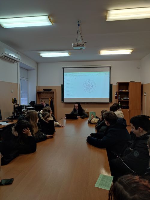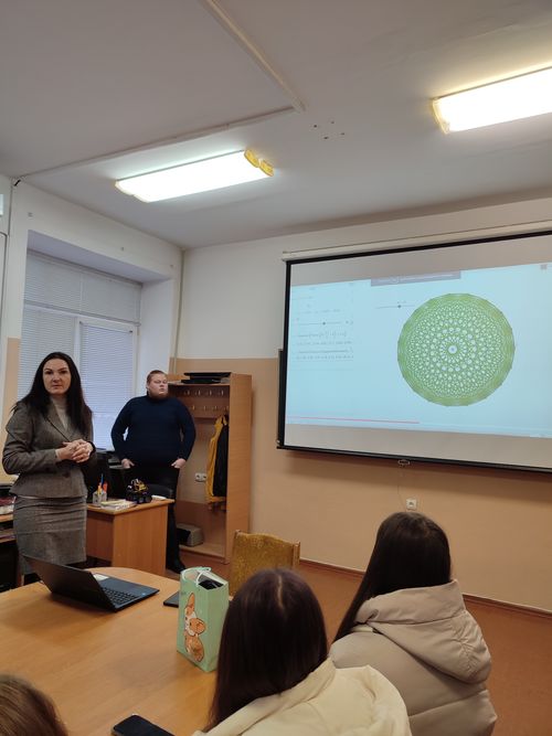 На майстер-класі «Математика та мистецтво» доктор педагогічних наук, доцент Ботузова Юлія Володимирівна познайомила учнів зі світом краси та естетики, який створюється на основі математичних обчислень та геометричних побудов. Були продемонстровані картини з напряму «Curve Stitching» та побудовано одну з них. Також учні навчилися створювати та програмувати динамічні зображення квітки у математичного програмному засобі GeoGebra.