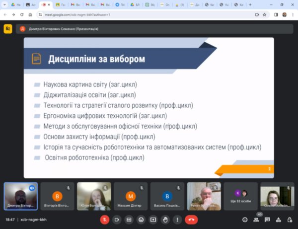 29 лютого 2024 року деканатом факультету математики, природничих наук та технологій, а також кафедрою математики та цифрових технологій для студентів спеціальностей Середня освіта (Математика), Професійна освіта (Цифрові технології) та Статистика першого (бакалаврського) рівня вищої освіти було організовано презентацію вибіркових дисциплін, що визначають індивідуальну освітню траєкторію студентів.