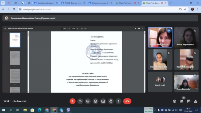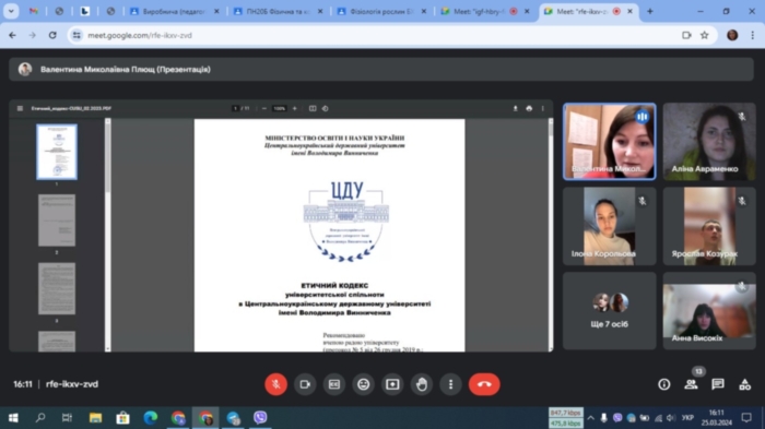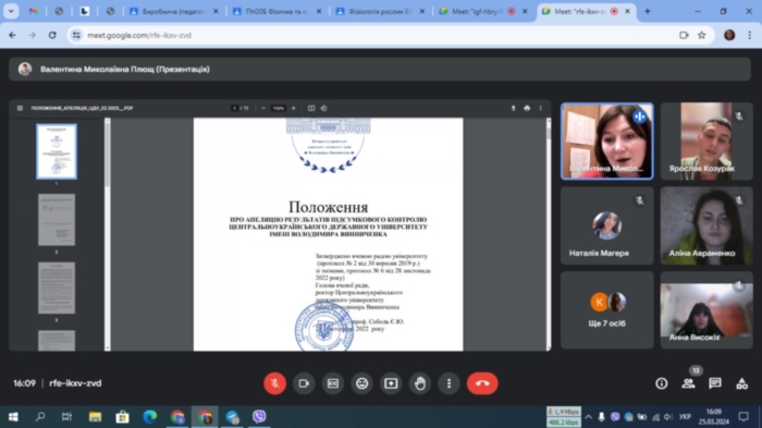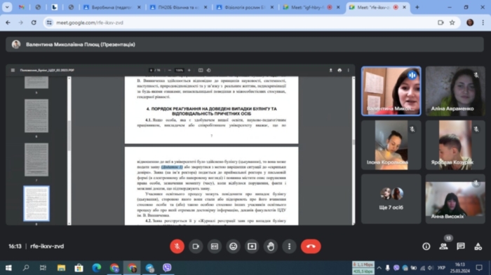 25 березня 2024 року під час онлайн зустрічі Валентина Плющ зі здобувачами освіти пригадали основні положення деяких нормативних документів, що регулють їх права та обов’язки членів університетської спільноти: