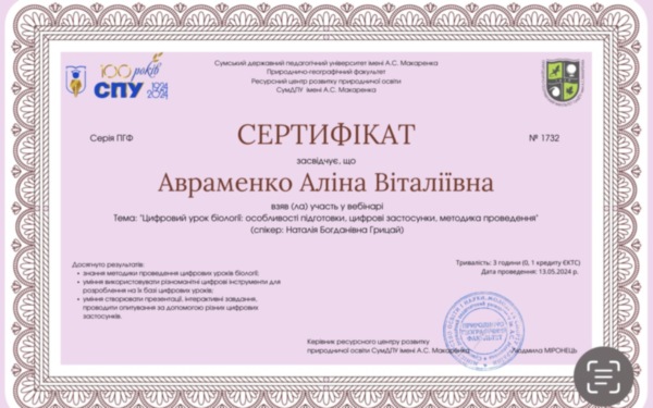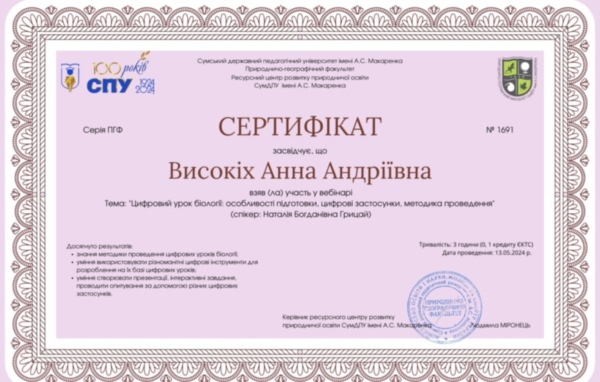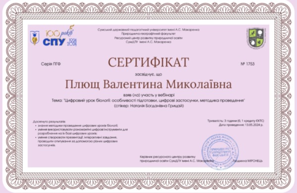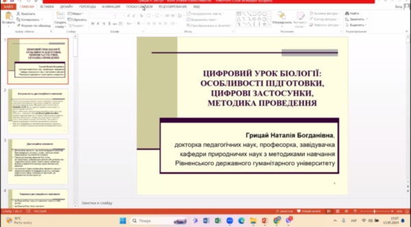 13 травня Валентина Плющ – д.п.н., професор кафедри природничих наук та методик їхнього навчання разом зі здобувачами освіти першого (бакалаврського) рівня вищої освіти спеціальності 014.15 Середня освіта (Природничі науки) взяли участь у гостьовій лекції докторки педагогічних наук, професорки, завідувачки кафедри природничих наук з методиками навчання Рівненського державного гуманітарного університету Грицай Наталії Богданівни на тему: “Цифровий урок біології: особливості підготовки, цифрові застосунки, методика проведення”, в межах роботи Відкритого міжуніверситетського лекторію “Професійно-методична підготовка педагога з проблем природничої освіти”, що організовано Волинським національним університетом імені Лесі Українки та Рівненським державним гуманітарним університетом.