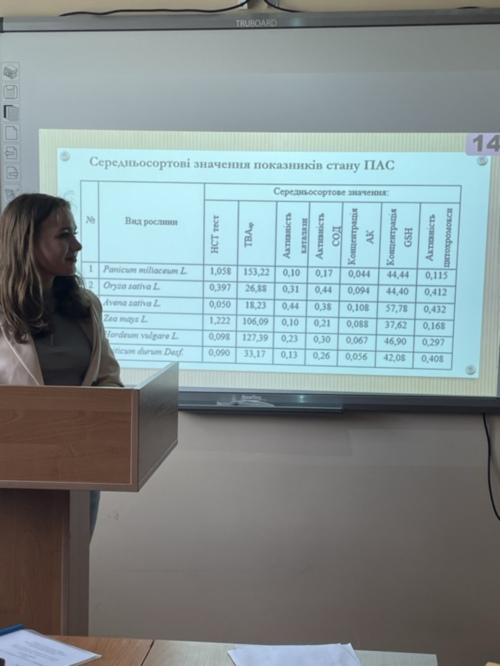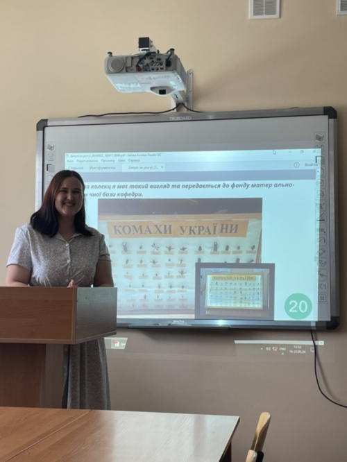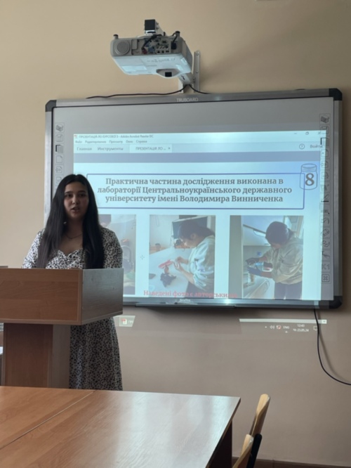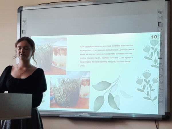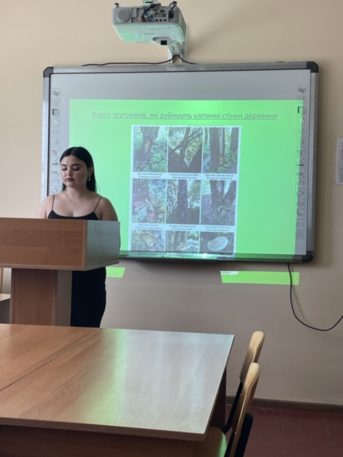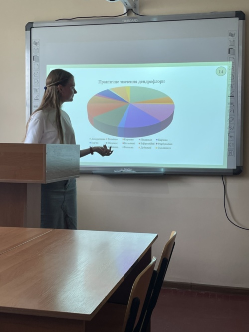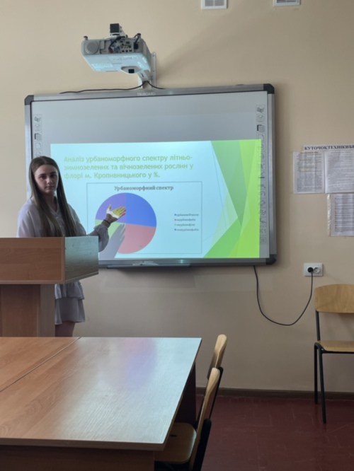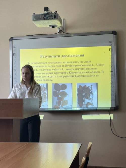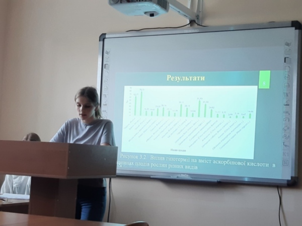 Так, Перепелкіна Анна доповіла про проблему ураження деревних рослин трутовиками і показала альтернативні шляхи використання біологічно-активних речовин, які виділяє трутовик в корисних господарських цілях. Херсун Максим навів статистичні дані щодо озеленення міста Кропивницький хвойними рослинами, а Копотій Анна розповіла про літньо-зимньозелені та вічнозелені рослини і флорі нашого міста. Досліджуючи флору рідного села Михайлівка, Бойко Вікторія розповіла про алелопатично-активні рослини. Тоді ж, як Сус Лілія ознайомила присутніх з дендрофлорою села Якимівка, результати дослідження якої мають апробацію на міжнародній конференції. Апробованою міжнародною конференцією є також робота Піцик Катерини, присвячена дослідженню впливу різного температурного режиму на вміст аскорбінової кислоти в тканинах рослин. Вагомого практичного значення для поповнення матеріально-технічної бази кафедри мали роботи Потапчук Сабіни та Доценко Вікторії. Так, Сабіна в рамках завдань курсової «Особливості виготовлення та використання колекції вологих препаратів» відновила 71 вологий препарат, перевезений з природничо-географічного факультету, а Доценко Вікторія, виготовила 2 ентомологічні стенди з оновленою колекцією комах України. Особливу увагу заслуговує робота Затуливітер Людмили на тему «Особливості впливу прооксидантно-антиоксидантної системи на стійкість сорту рослин до хвороб», яка має апробації на 2-х міжнародних конференціях, статтю у журналі «Наукові записки молодих учених», впровадження у роботу сектору біології та обліку Кіровоградського НДЕКЦ і виборола 2 місце по Україні на Всеукраїнському конкурсі студентських наукових робіт з біотехнології. Робота оцінена на 100 балів. Комісія відмітила високий рівень виконання всіх курсових проєктів, та рекомендувала найкращим студентам подати матеріали для апробації на конференції та в наукові журнали.