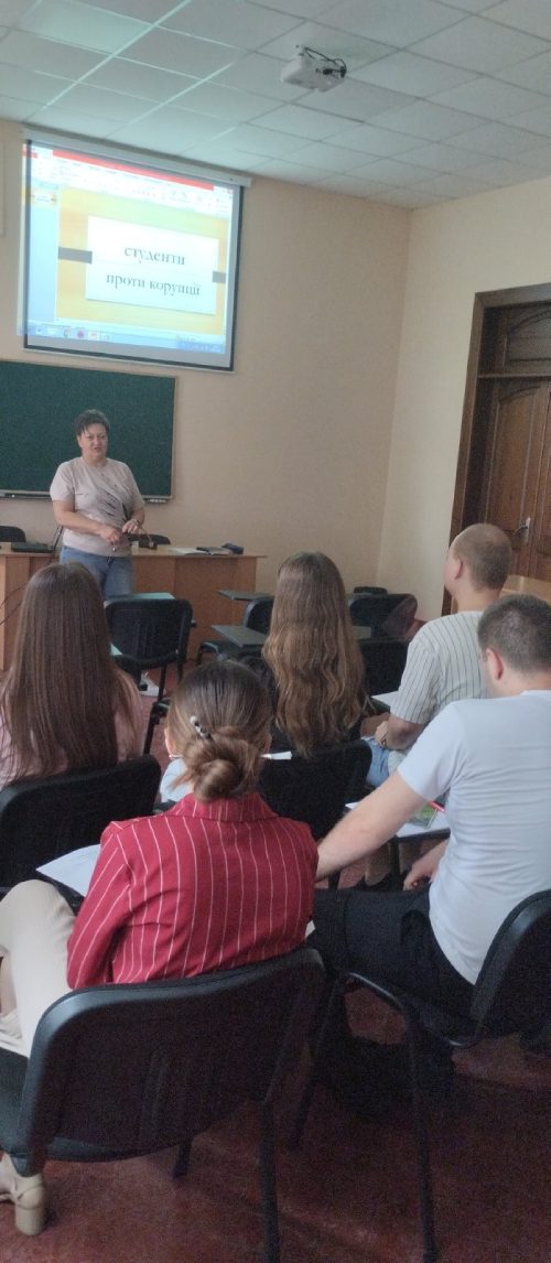 Олена Миколаївна акцентувала увагу на понятті «корупція», його походженні та різновекторному трактуванню. Під час інтерактивної бесіди зі студентами Олена Миколаївна навела яскраві приклади з повсякденного життя, та своєї професійної діяльності. Під час жвавого обговорення студенти дізналися хто є викривачами корупції, алгоритм дій при виявленні корупції, розібрали проблемні ситуації та способи їх вирішення, відповідали на проблемні запитання та ставили відповідники, які їх хвилюють.