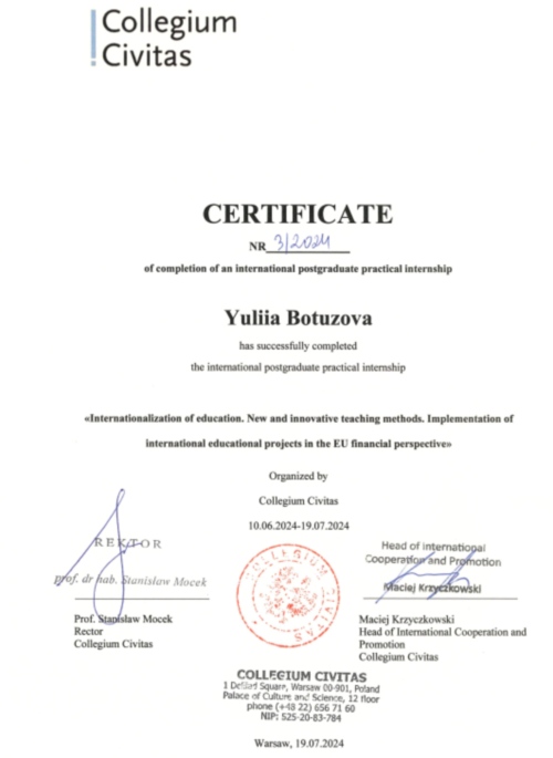 У липні 2024 року доцент кафедри математики та цифрових технологій Ботузова Юлія Володимирівна успішно завершила міжнародне стажування за програмою «Інтернаціоналізація вищої освіти» у приватному університеті Collegium Civitas, Польща. Це стажування стало важливим кроком у підвищенні професійного рівня та наданні нових можливостей для розвитку міжнародної співпраці, інтеграції найкращих практик в освітній процес нашого університету.