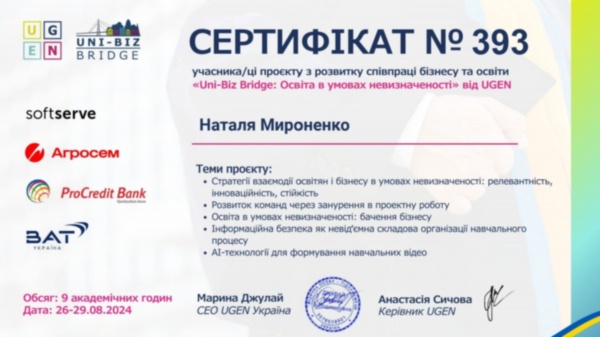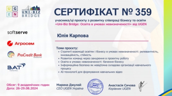 Доцентки секції технологічної та професійної освіти Оксана Абрамова, Ольга Пуляк та Наталя Мироненко разом зі студенткою спеціальності Професійна освіта (Технології виробів легкої промисловості) Юлією Карповою пройшли навчання в рамках проєкту з розвитку співпраці бізнесу та освіти «Uni-Biz Bridge: Освіта в умовах невизначеності» від української агенції UGEN. Навчання тривало з 26 по 29 серпня 2024 року. По завершенні навчання та успішного проходження тестування, слухачі мали можливість отримати сертифікати.