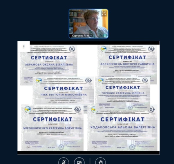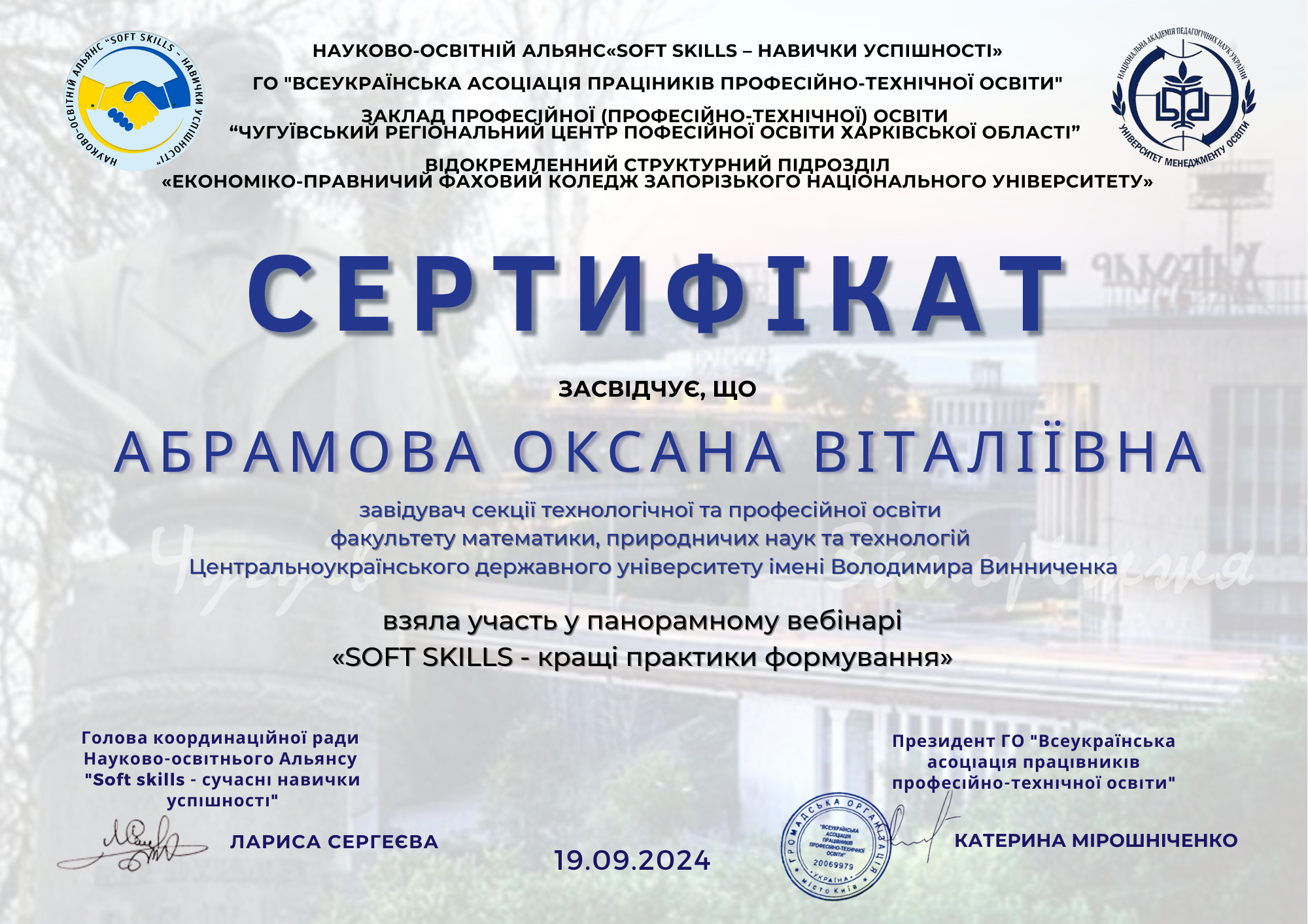 19 вересня об 11:30 відбувся панорамний вебінар «Soft skills – кращі практики формування». До членів Всеукраїнського науково-освітнього альянсу «Soft skills – сучасні навички успішності» було прийнято два нових члени-заклади освіти, це Чугуївський регіональний центр професійної освіти Харківської області та Економіко-правничий фаховий коледж Запорізького національного університету, викладачі яких долучилися до вебінару із доповідями.