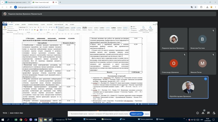 Гарант освітньої програми Людмила Яременко ознайомила студентів з авторською методичною системою оцінювання роботи практикантів. Також вона розповіла про нові види моніторингових досліджень у відділі забезпечення якості та цифрового супроводу освіти ЦДУ імені Володимира Винниченка, де студенти будуть проходити виробничу практику. Людмила Іванівна зазначила, що інформаційно-аналітична діяльність у відділі, до якої мають можливість долучитися практиканти, безсумнівно сприятиме їх професійному росту та удосконаленню фахових компетентностей.