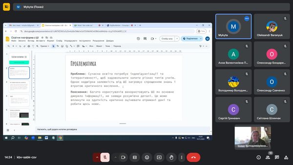Сергій Гриневич розповів свій досвід використання генеративного штучного інтелекту для створення навчальних матеріалів на основі флеш-карток. Розроблена ним система буде корисною для тих, хто вивчає іноземні мови або опановує складну термінологію. Освітня тематика виявилася цікавою і Микиті Шилову: його бентежить, як використовувати штучний інтелект в освіті так, щоб не нашкодити учням, а саме не сформувати у них надмірну залежність від ШІ та запобігти втраті критичного мислення. Розроблена Микитою освітня платформа якраз і призначена допомоти викладачам розробляти навчальні курси за допомогою штучного інтелекту, не втрачаючи здатності критично оцінювати отримані дані.