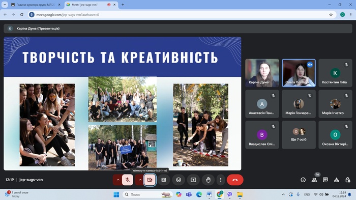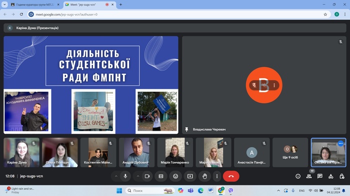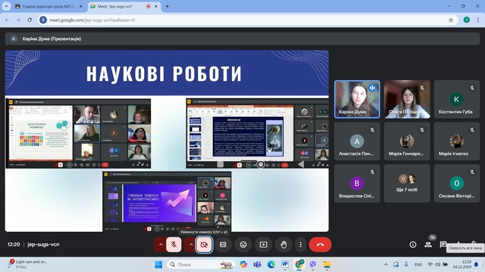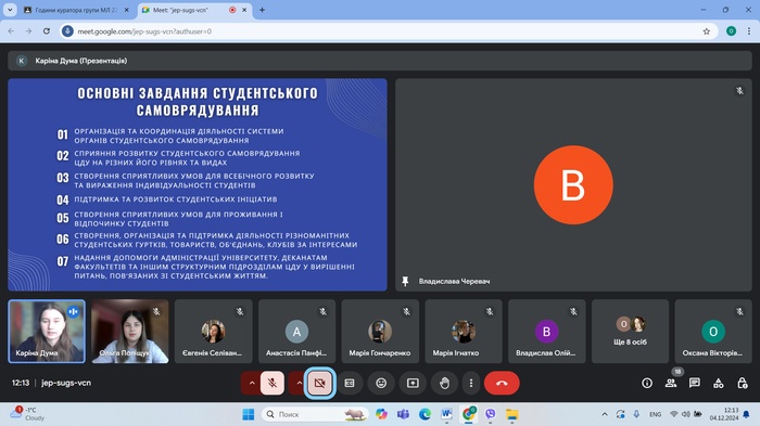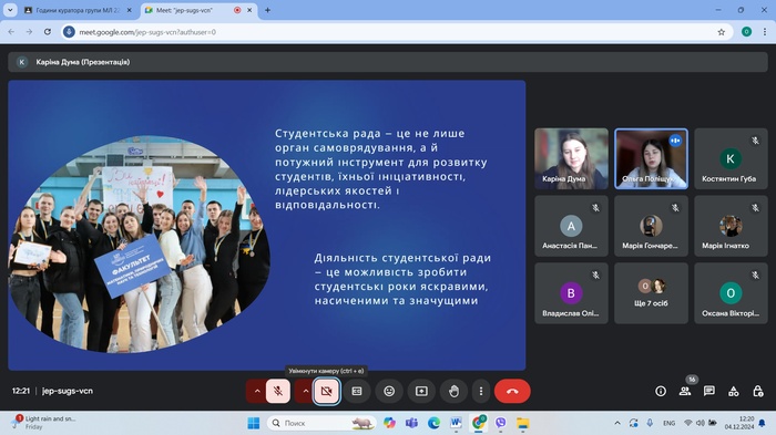 4 грудня 2024 року відбулася зустріч студентів груп ЕК24Б, ЕК23Б, ЕК22Б спеціальності 051 Економіка (Освітня програма економічна безпека) кафедри менеджменту та підприємництва ЦДУ ім. В. Винниченка з представниками органів студентського самоврядування. Перед студентами виступали та презентували основні завдання студентського самоврядування голова студентської ради факультету математики, природничих наук та технологій Ольга Поліщук та член студентської ради Каріна Дума, які є здобувачками освіти за напрямками 073 Менеджмент та 051 Економіка.