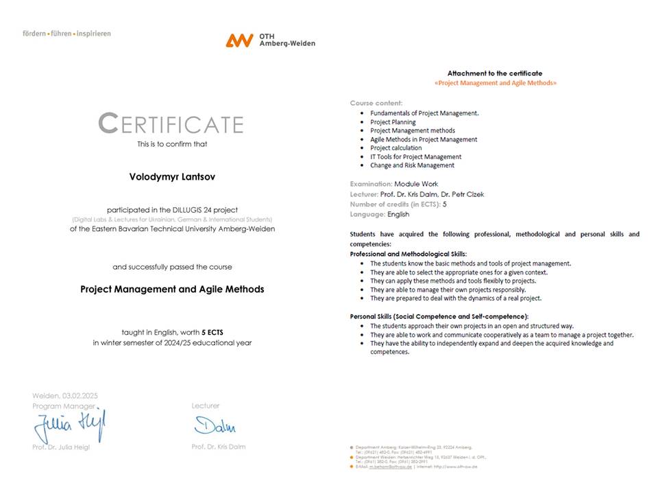 Дана програма зосереджена на темі «Управління проєктами та Agile методами», що стає все більш актуальним в сучасному світі. Навчання відбувалось англійською мовою професорами Східно-баварського університету Амберг-Вайден (Німеччина).