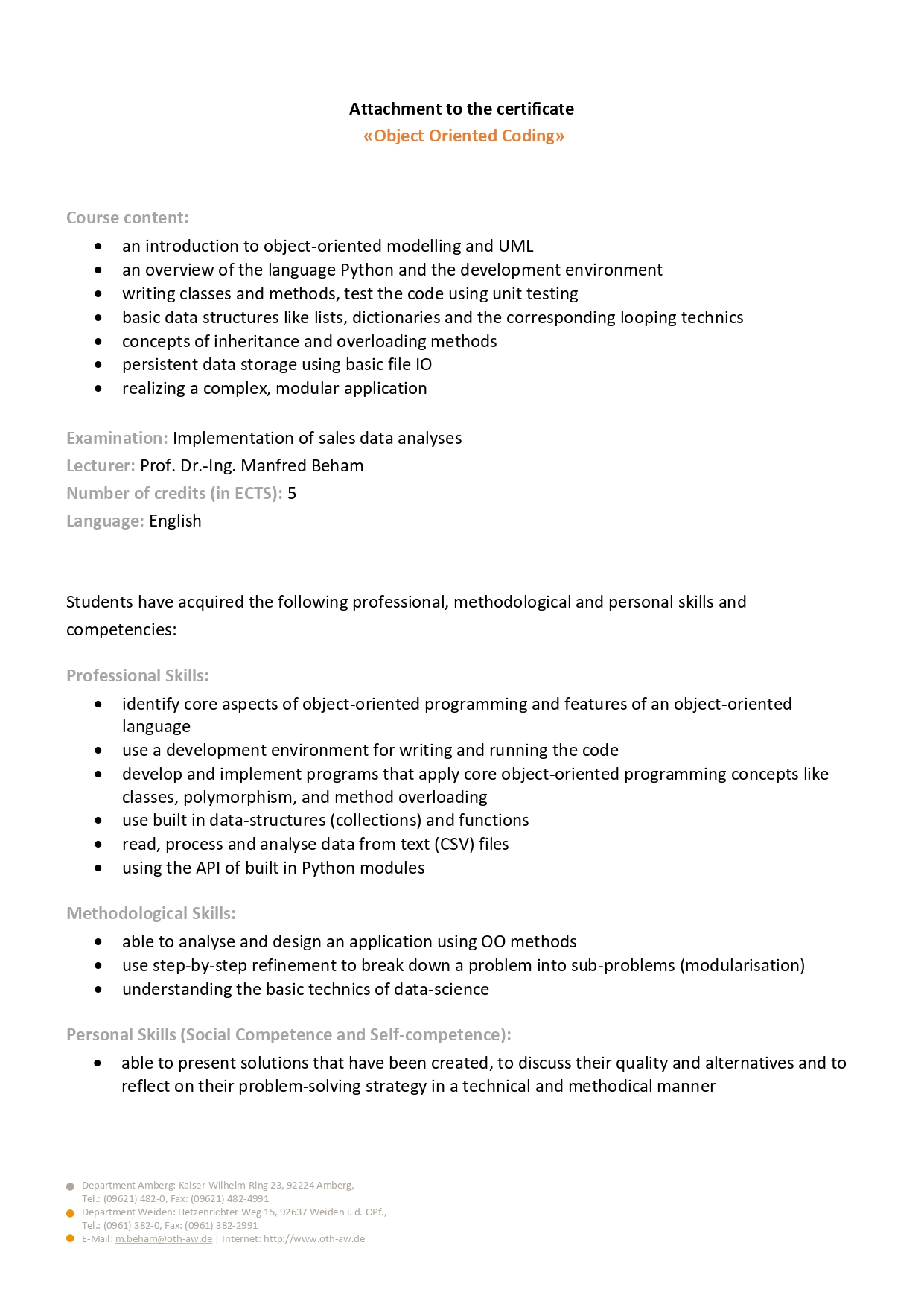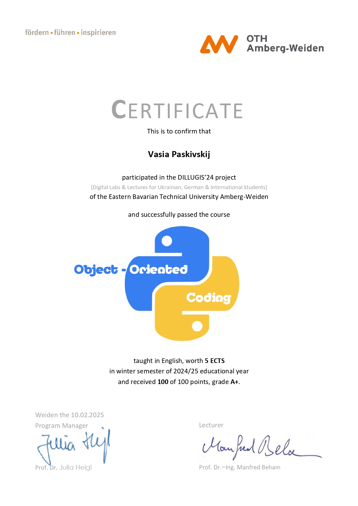 Протягом жовтня 2024 р. – лютого 2025 р. у рамках проєкту DILLUGIS (Digital Labs & Lectures for Ukrainian, German & International Students) студенти спеціальності 015 Професійна освіта (за спеціалізаціями) (спеціалізація: 015.39 Цифрові технології ) Василь Пашківський (ЦТ22Б) та Роман Островський (ЦТ24М) успішно завершили дистанційний курс «Object – Oriented Coding» (5 кредитів, форма контролю – екзамен) в East-Bavarian Technical University Amberg-Weiden (Німеччина).