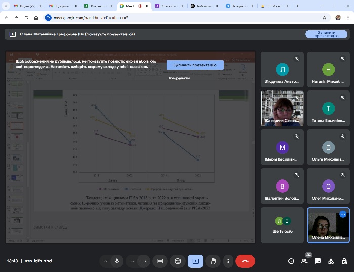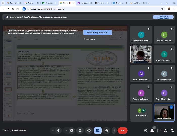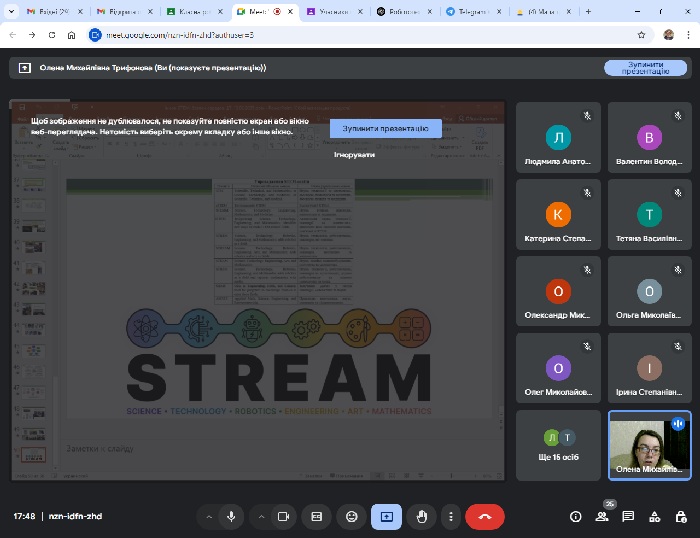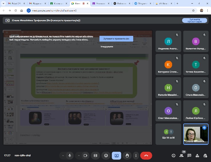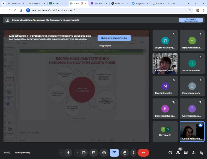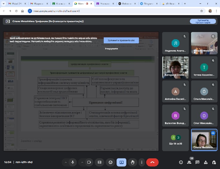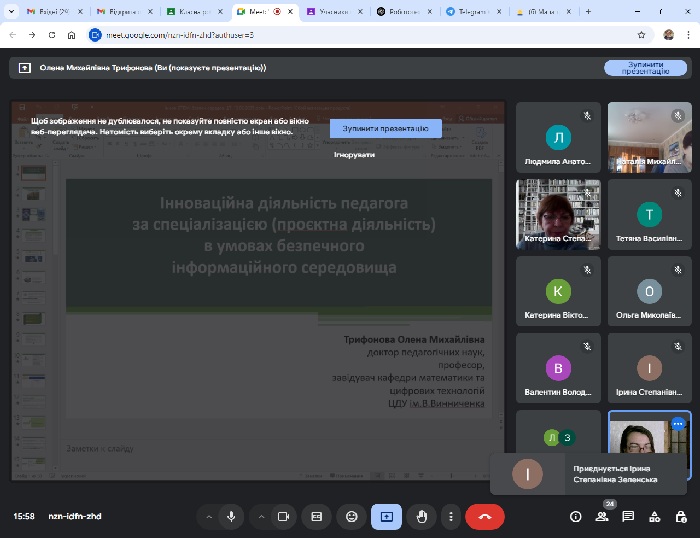 Д.пед.н., професор, завідувач кафедри математики та цифрових технологій О.М.Трифонова презентувала лекцію на тему «Інноваційна діяльність педагога за спеціалізацією (проєктна діяльність) в умовах безпечного інформаційного середовища». У ході виступу було висвітлено ключові аспекти організації проєктної діяльності в цифровому освітньому просторі, зокрема роль цифрових інструментів у створенні інтерактивного освітнього контенту, командній роботі та оцінюванні результатів навчання. На практичному занятті слухачі отримали можливість опрацювати методики розвитку цифрової компетентності та особливості впровадження проєктного підходу у власну педагогічну діяльність. Особливу увагу було приділено питанням кібербезпеки, захисту персональних даних та відповідальному використанню цифрових ресурсів. Активне обговорення та практичні завдання дозволили учасникам поглибити знання щодо інноваційних методів навчання в умовах цифровізації освіти.