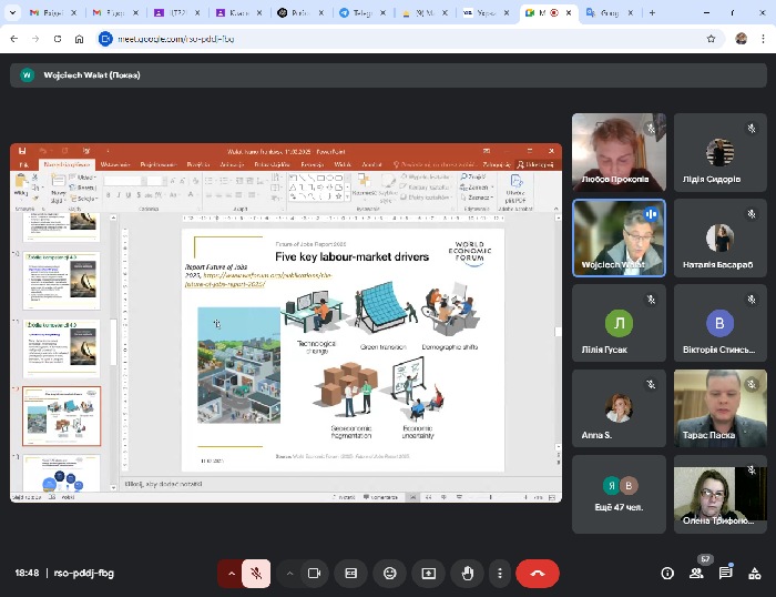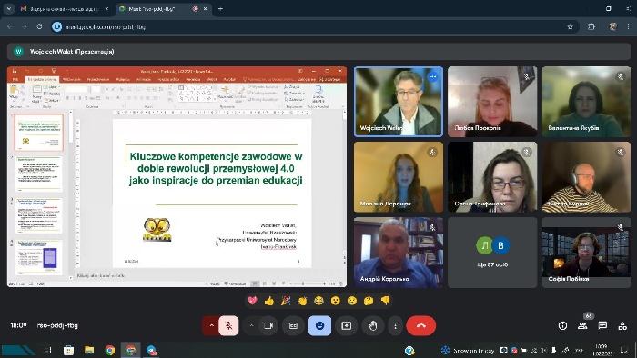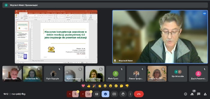 11 лютого 2025 року відбулася онлайн-лекція на тему «Ключові професійні компетенції в епоху промислової революції 4.0 як натхнення для трансформації освіти». Лектором виступив Войцєх Валят – доктор габілітований, доктор гуманітарних наук у галузі педагогіки, професор Жешувського університету (Республіка Польща), професор кафедри педагогіки та освітнього менеджменту імені Богдана Ступарика Прикарпатського національного університету імені Василя Стефаника.