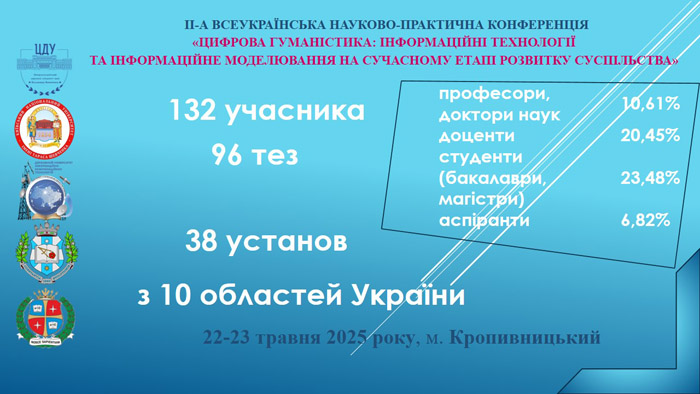Слід відзначити, що порівняно з минулим роком популярність конференції зросла: участь у ній взяли більше 130 учасників з майже 40 установ України, серед яких класичні та технічні університети, заклади загальної середньої та професійної освіти, ІТ компанії тощо з Кропивницького, Києва, Черкас, Дніпра, Харкова, Львова, Луцька, Одеси, Миколаєва, Тернополя. Цікава конференція й тим, що до участі в ній залучаються і професори, доктори наук (»10%), і доценти (»20%), і аспіранти (»7%), і студенти (»24%), що безумовно корисно для обміну досвідом, ідеями та підходами до вирішення актуальних проблем в сфері цифровізації суспільства.