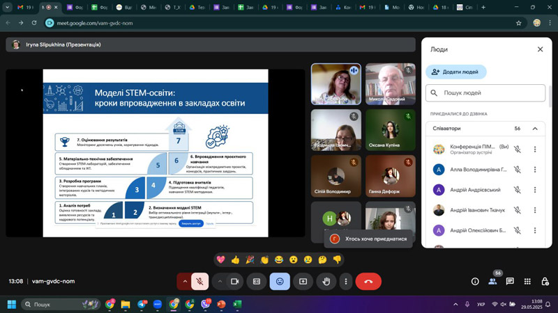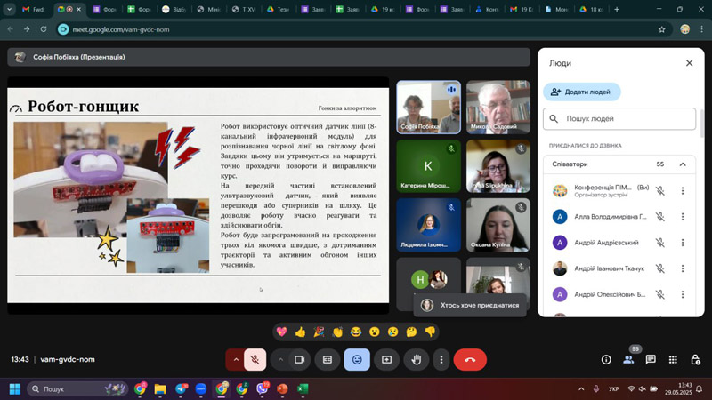 Дмитро Соменко кандидат педагогічних наук, старший викладач кафедри математики та цифрових технологій, Софія Побіяха студентка спеціальності Професійна освіта (Цифрові технології) Центральноукраїнського державного університету імені Володимира Винниченка; Алла Гобова викладач фізики та інформатики, Анастасія Шульга студентка спеціальності Комп'ютерні науки Кам’янського енергетичного фахового коледжу продемонстрували результати досліджень з проєктної діяльності з робототехніки та її практичної реалізації в освітньому процесі ОП Професійна освіта (Цифрові технології) та ОП Комп'ютерні науки, розкрили роль штучного інтелекту в сучасній природничо-математичній освіті.