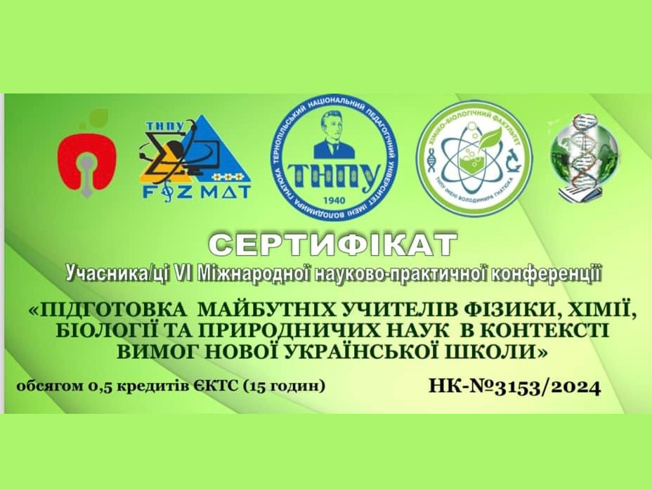 23 травня 2024 р. у Тернопільському національному педагогічному університеті імені Володимира Гнатюка відбулася VI Міжнародна науково-практична конференція «Підготовка майбутніх учителів фізики, хімії, біології та природничих наук у контексті вимог Нової української школи». Учасниками конференції були представники з різних регіонів України та зарубіжжя (більше 200 учасників, подано понад 120 наукових праць), зокрема участь у конференції взяли викладачі кафедри природничих наук і методик їхнього навчання Наталія Подопригора та Валентина Плющ, а також здобувачі освіти першого (бакалаврського) рівня вищої освіти спеціальності 014 Середня освіта (Природничі науки).