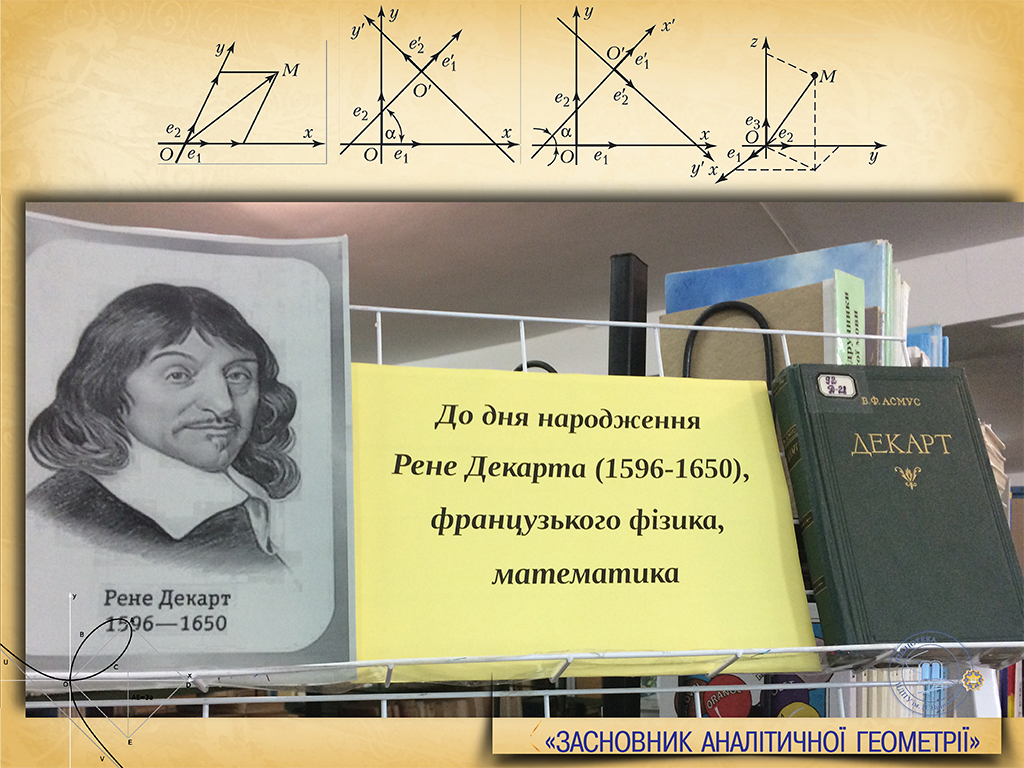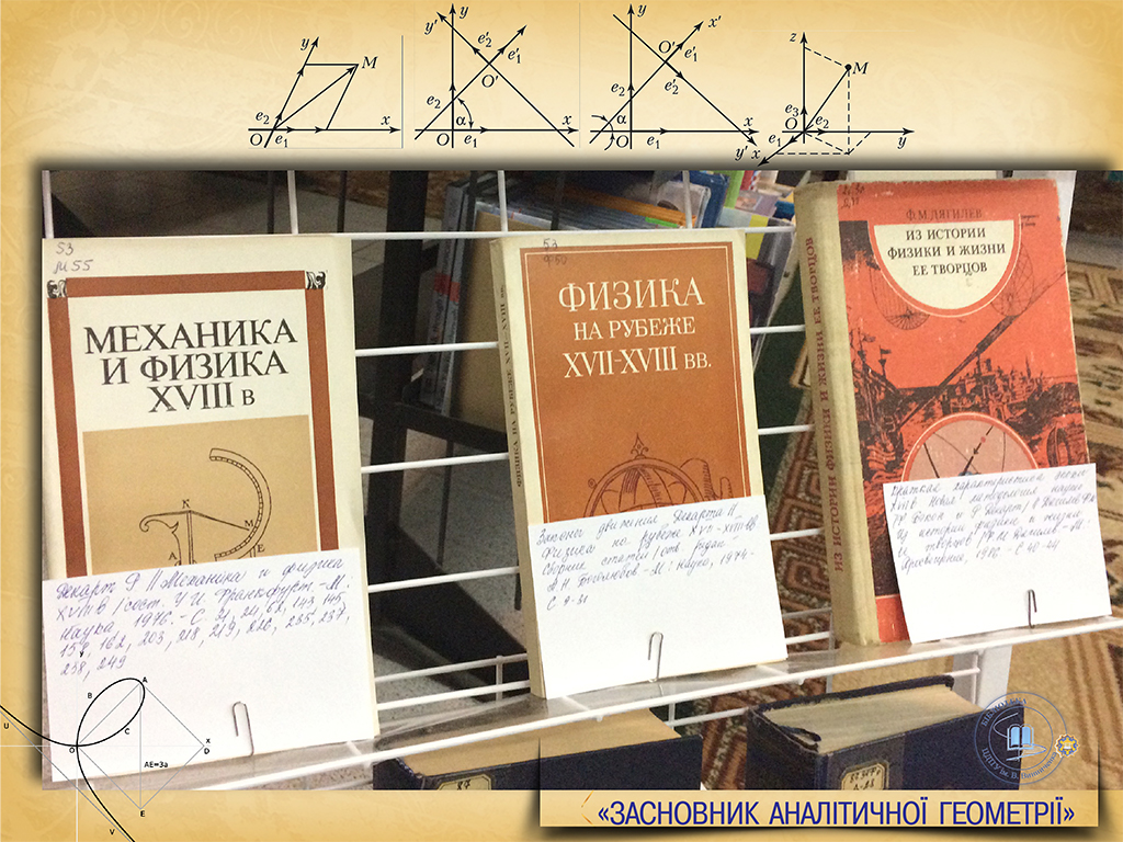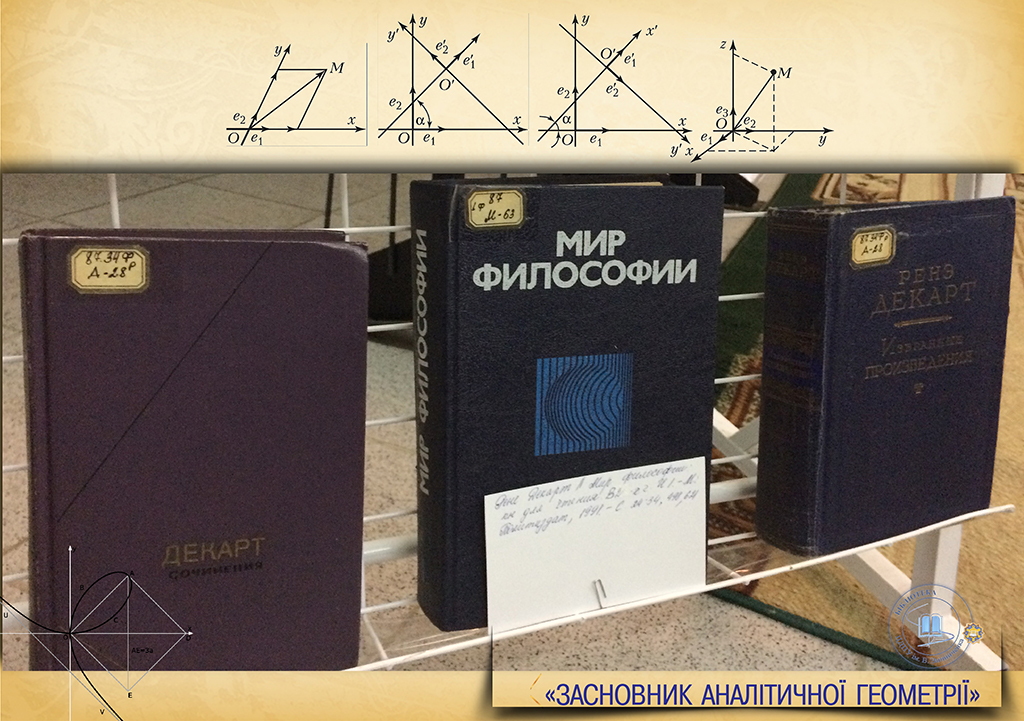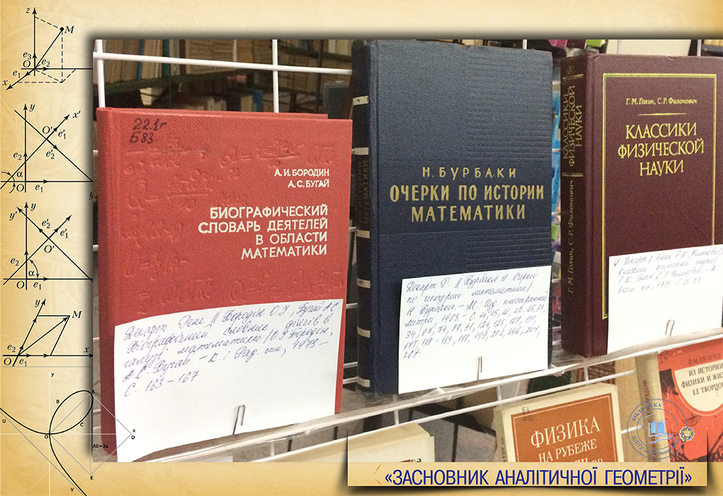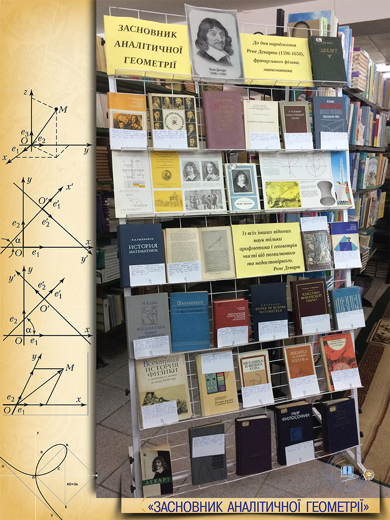 До дня народження Рене Декарта (1596-1650) бібліотекарі абонементу № 2 підготували книжкову виставку “Засновник аналітичної геометрії”.