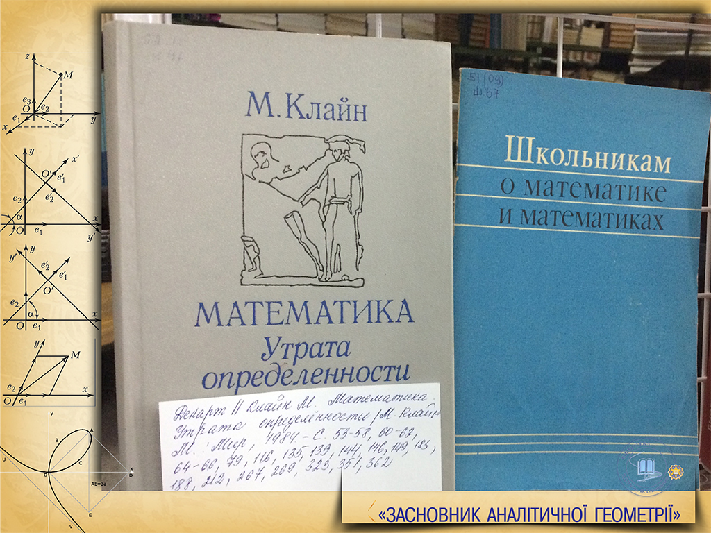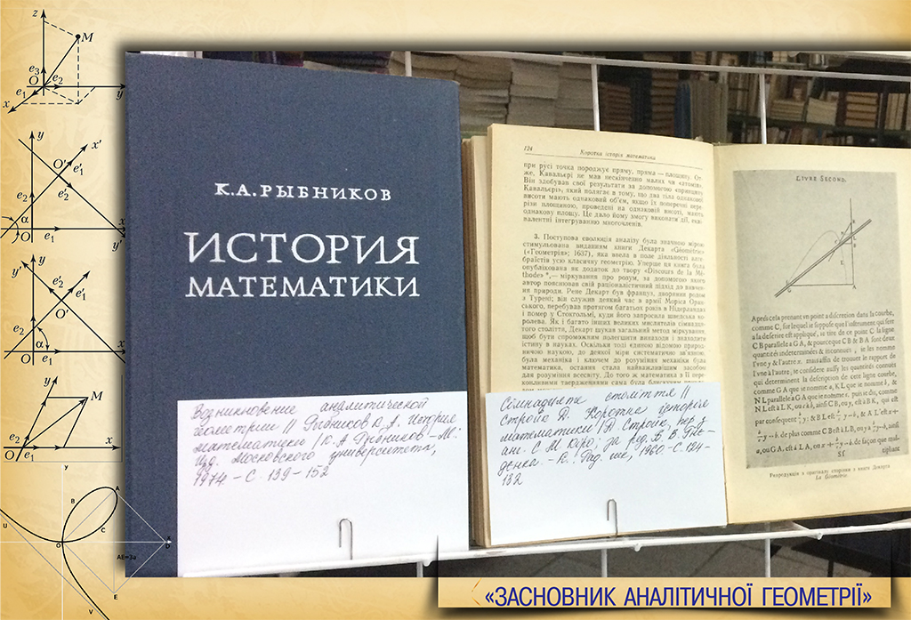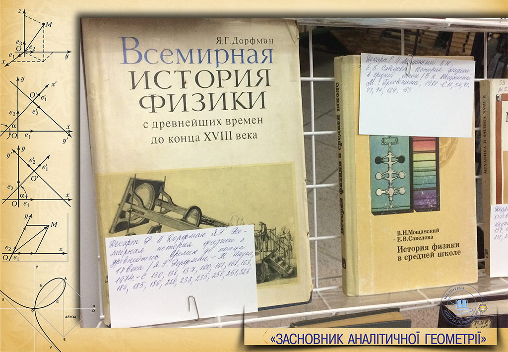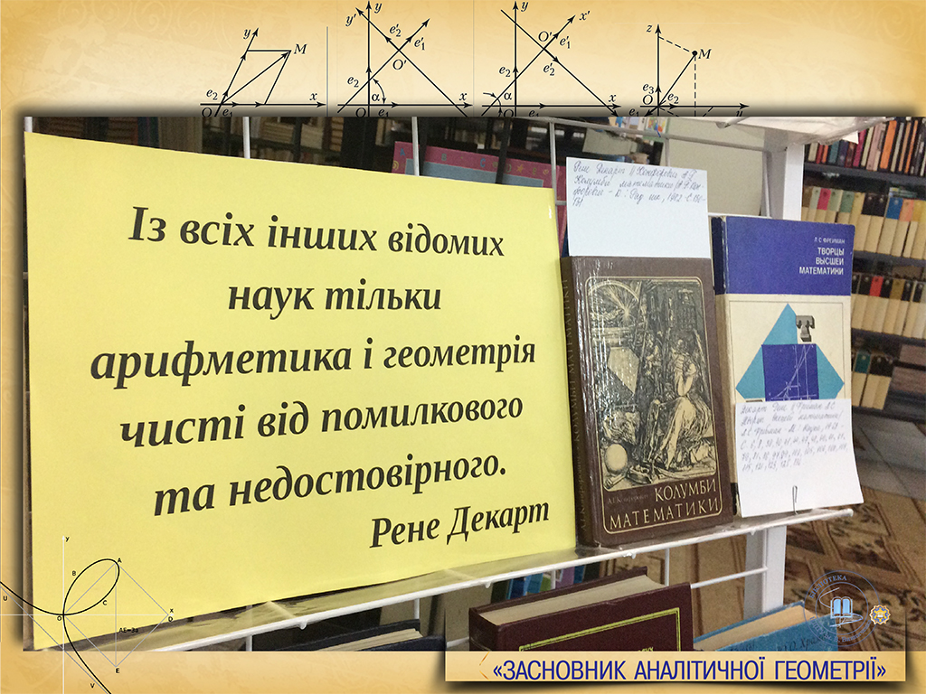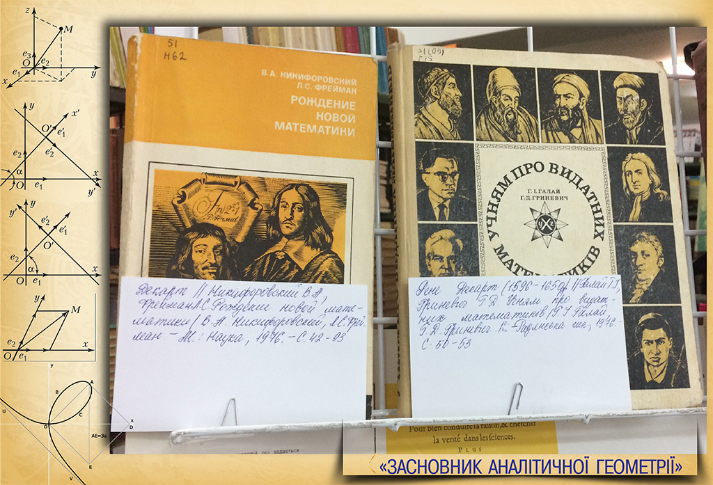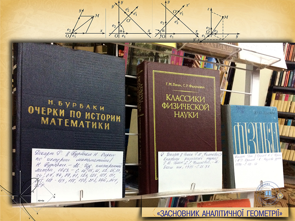 До дня народження Рене Декарта (1596-1650) бібліотекарі абонементу № 2 підготували книжкову виставку “Засновник аналітичної геометрії”.