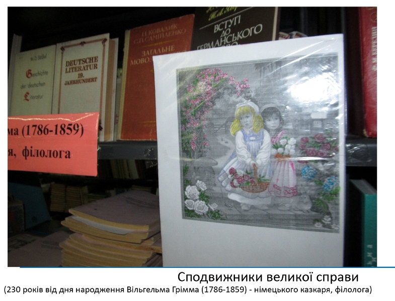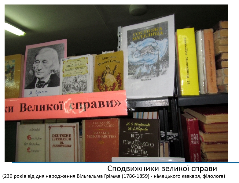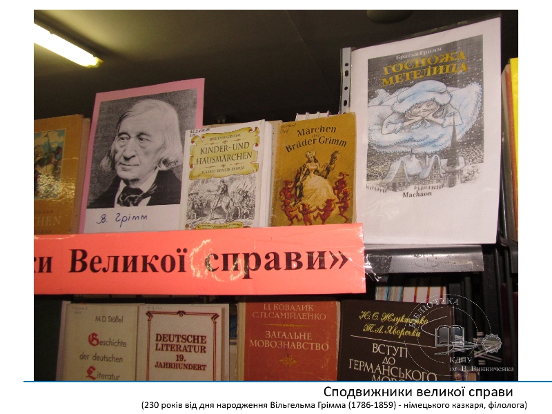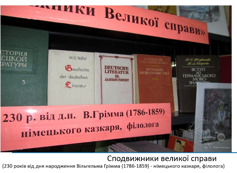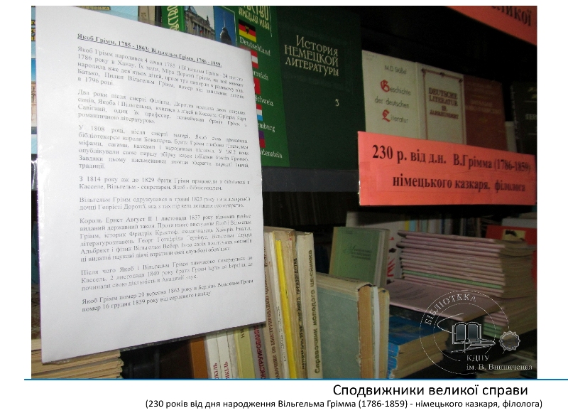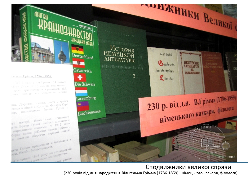 24 лютого 1786 року в Ханау народився Вільгельм Грімм . До 230-річчя від дня народження Вільгельма Грімма та спільної літературної і наукової діяльності братів на абонементі №2 з 15 по 29 лютого проходить виставка «Сподвижники великої справи».