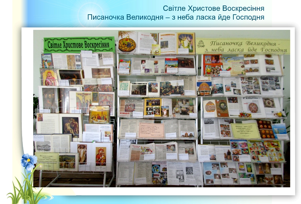 До світлого дня Великодня універсальний читальний зал приурочує виставки: «Світле Христове Воскресіння» та «Писаночка Великодня – з неба ласка йде Господня».