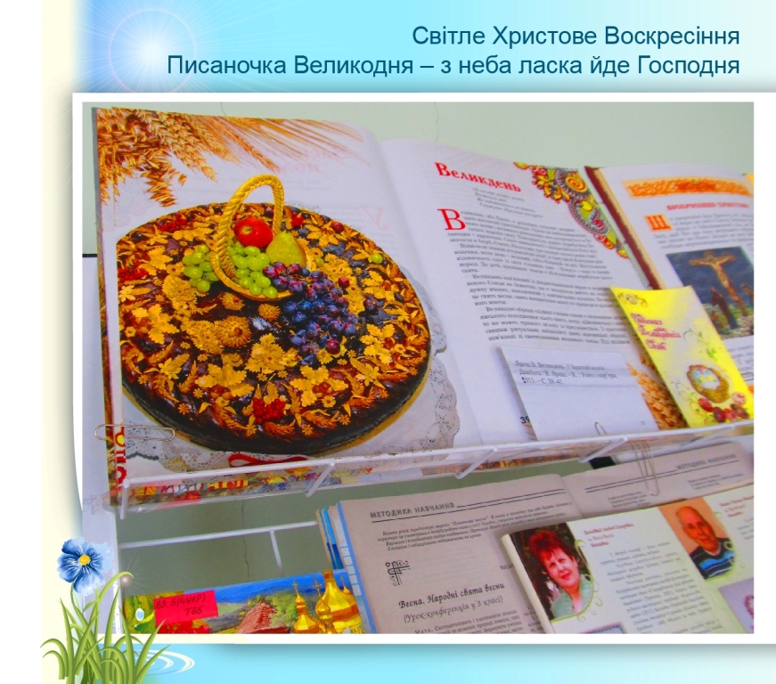 Рубрика «Писаночки Великодньої» знайомить читачів з етнографічними посібниками, періодичними виданнями, які описують народні звичаї святкування Великодня в Україні та Англії. Символ Пасхи – писанка – за словами О. Шевченко – « храм душі, в який народ вкладає у віщих знаках своє життя, свій дух, свою красу...» Відтворені писанкові фантазії у декулажі, у вигляді зелених галявин, візерункового плетіння, розфарбовані дивовижними орнаментами, прикрашені бісером, виготовлені з кольорового паперу, вишиті на рушниках.