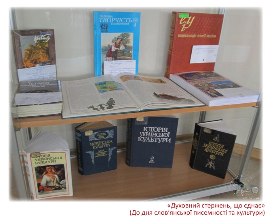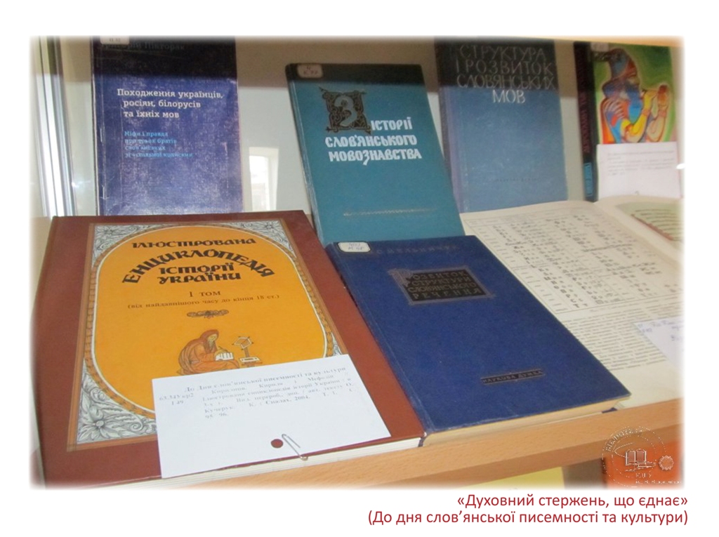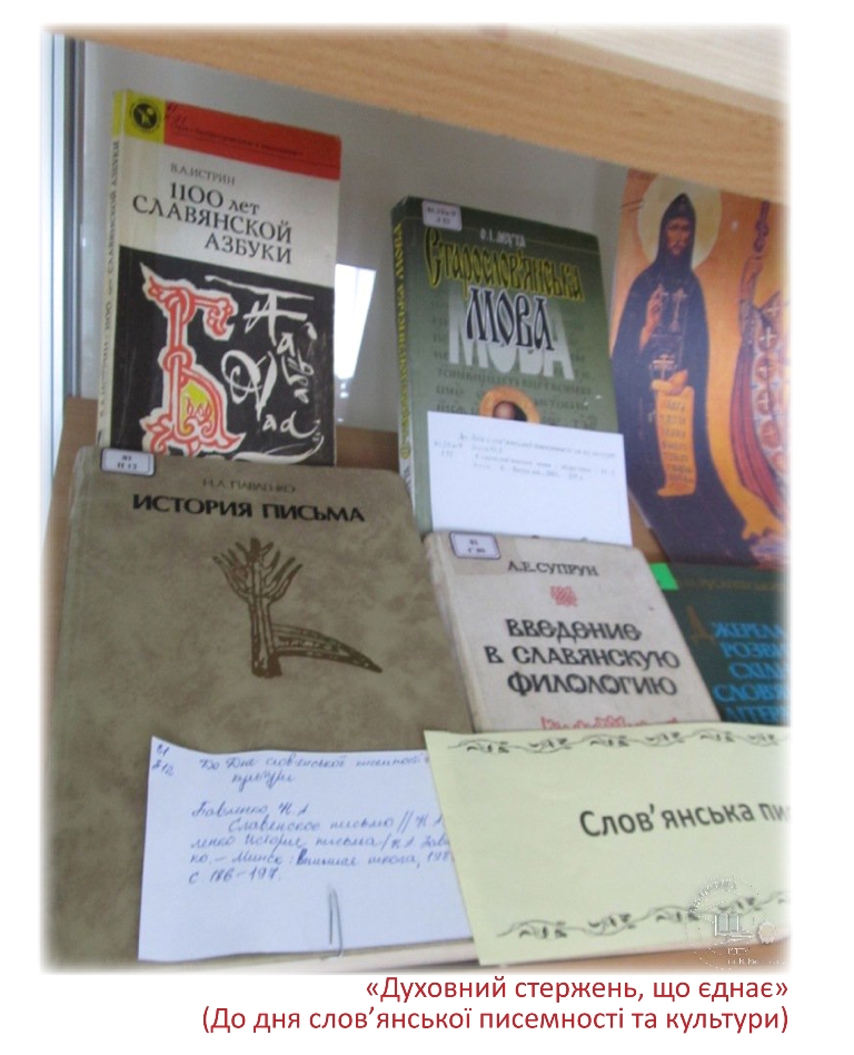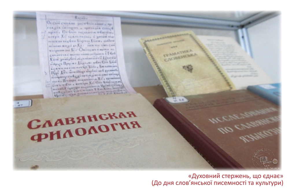 До дня слов’янської писемності та культури в читальному залі філологічних дисциплін експонується книжкова виставка «Духовний стержень, що єднає». Щорічно 24 травня в усіх слов’янських країнах відзначають день слов’янської писемності та культури.