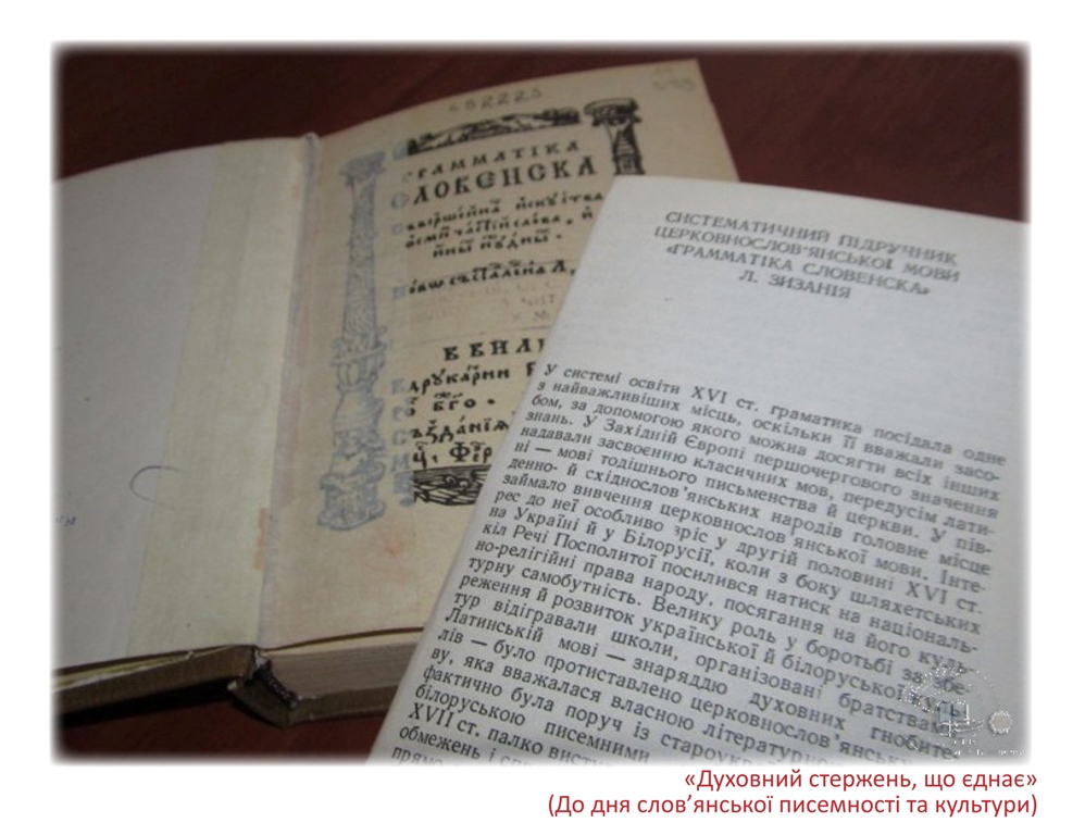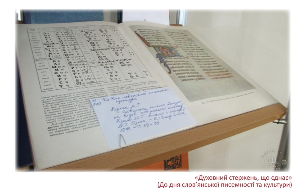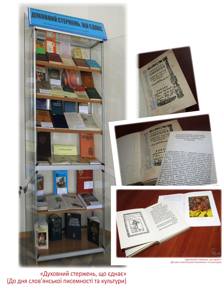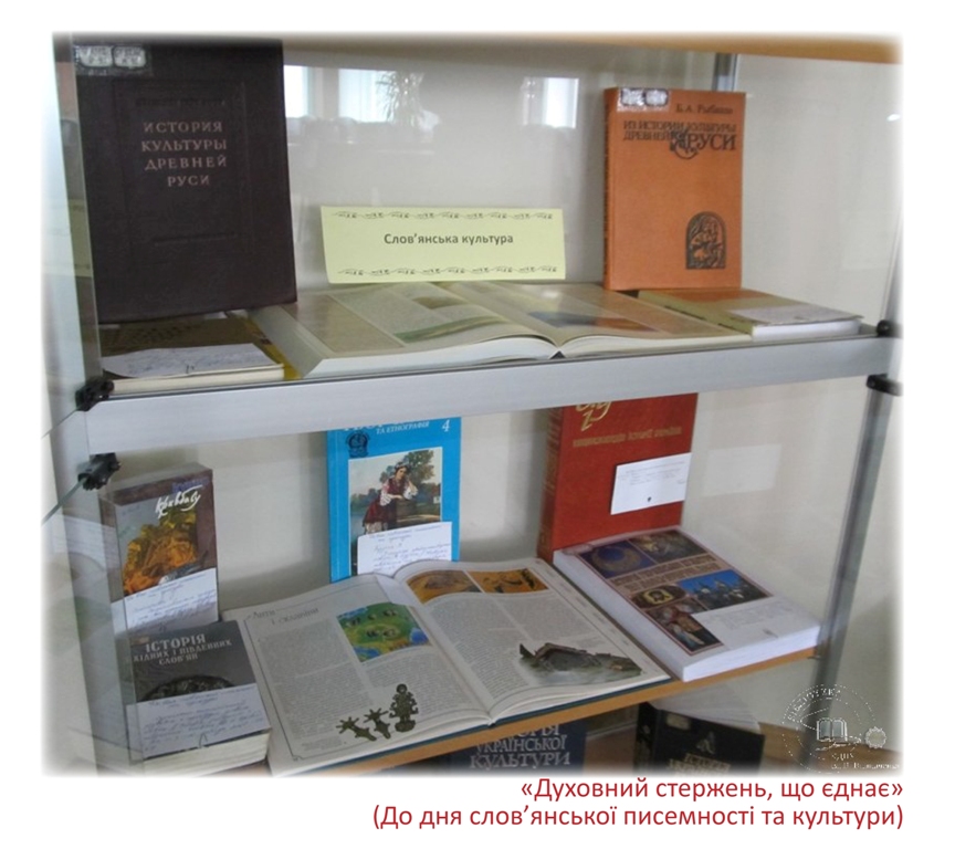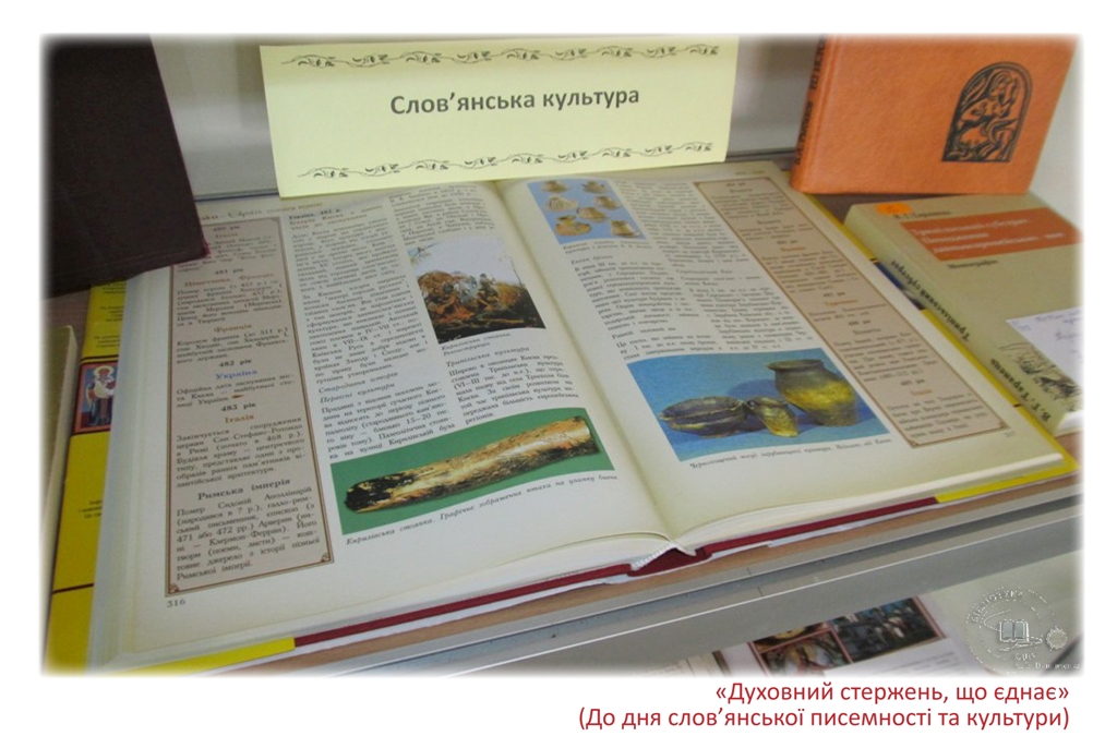 До дня слов’янської писемності та культури в читальному залі філологічних дисциплін експонується книжкова виставка «Духовний стержень, що єднає». Щорічно 24 травня в усіх слов’янських країнах відзначають день слов’янської писемності та культури.