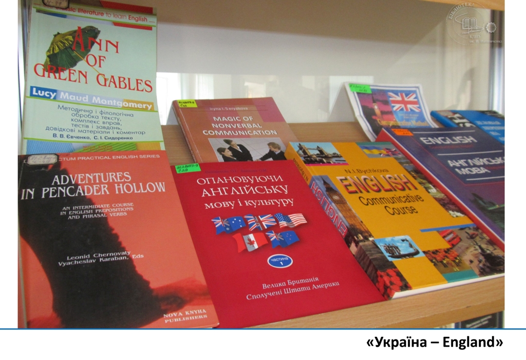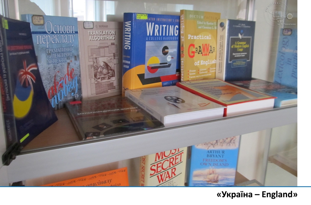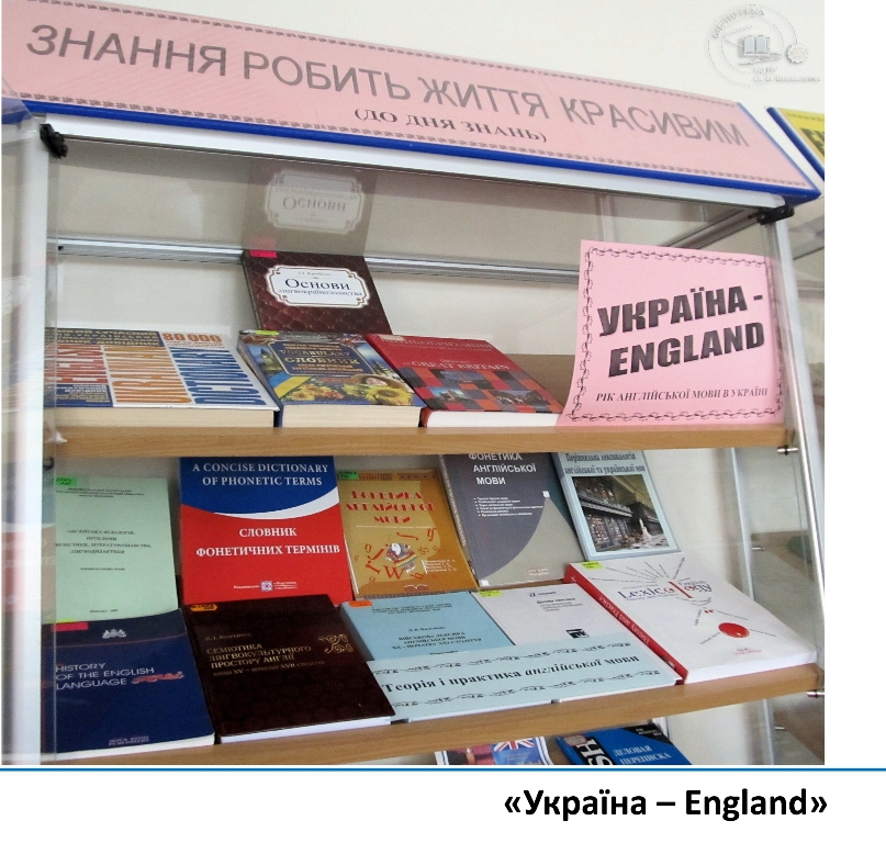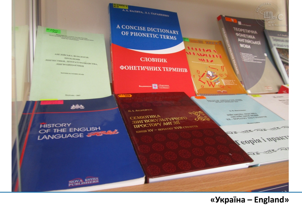 Шановні читачі! З нагоди Року англійської мови в Україні до вашої уваги пропонується тематична книжкова виставка «Україна – England», яка експонується в читальному залі філологічних дисциплін бібліотеки університету з 1 вересня.