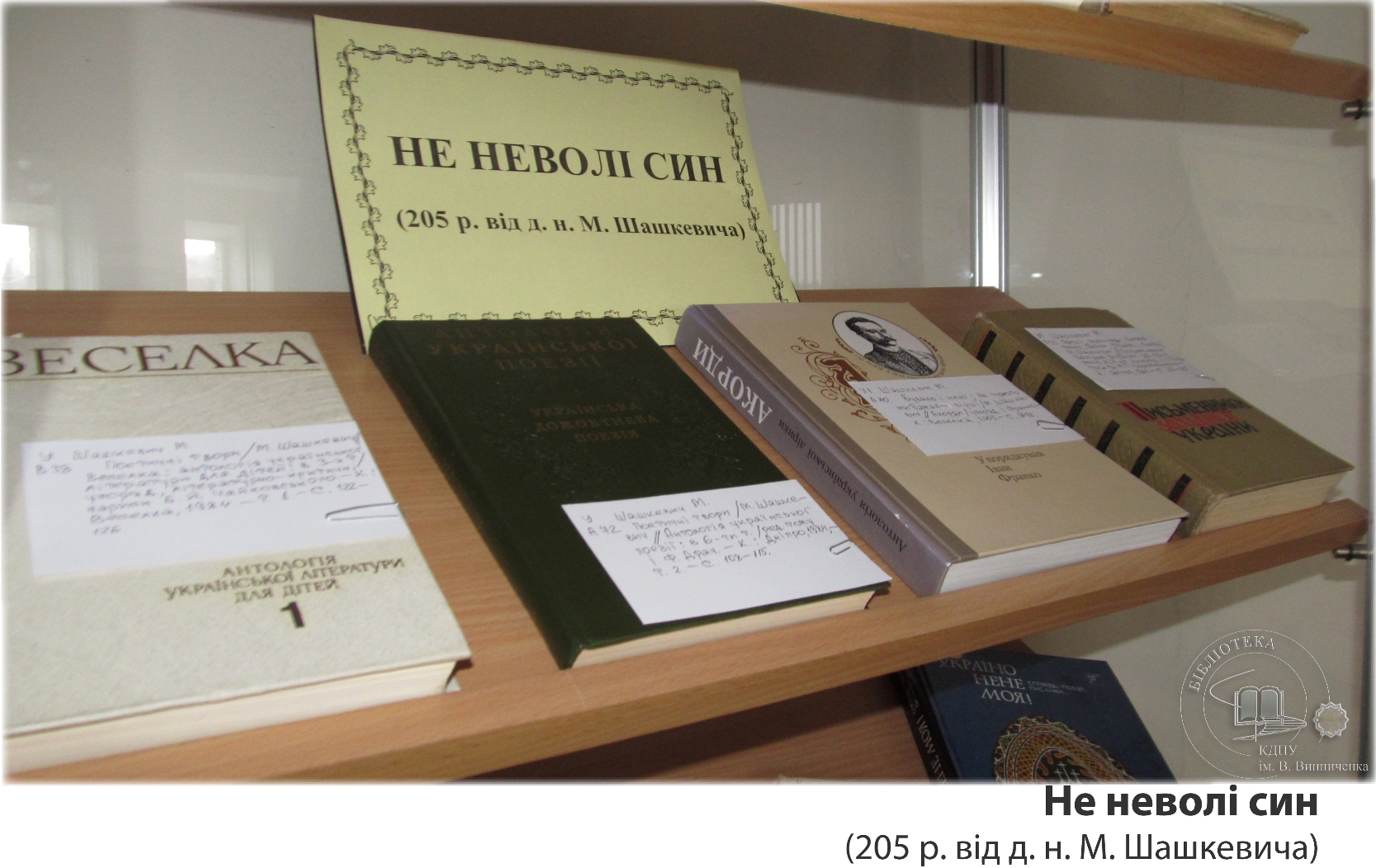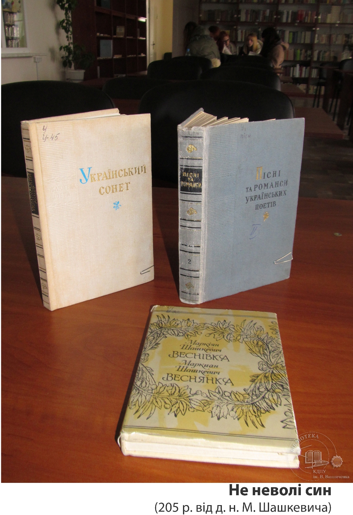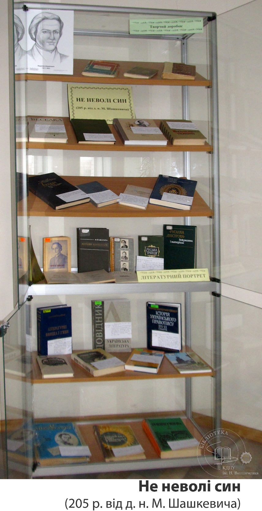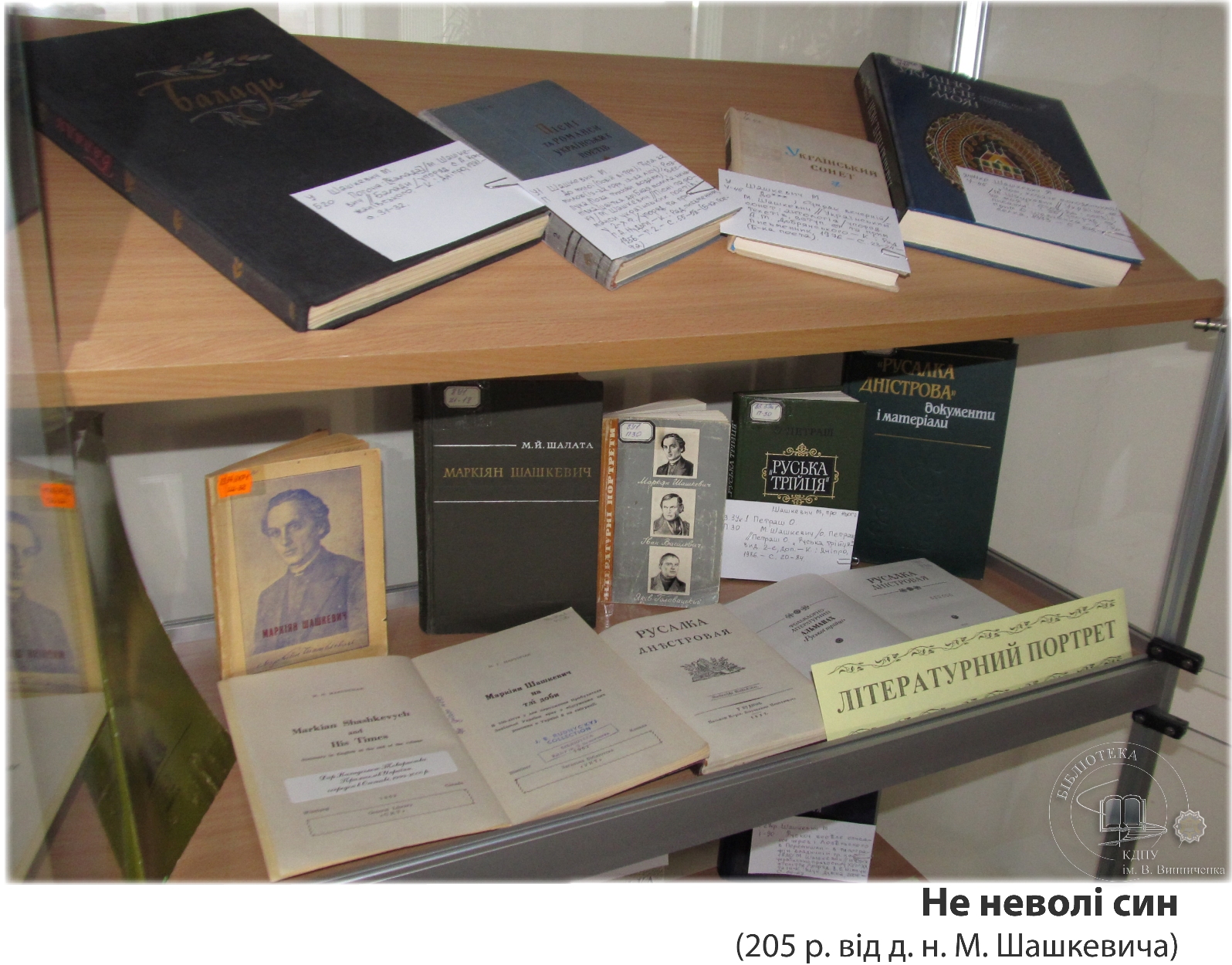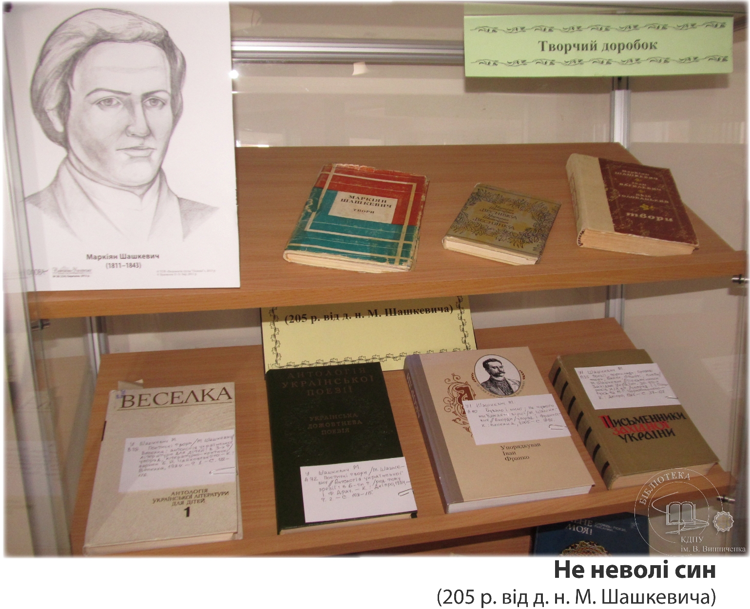 З 1 листопада в читальному залі філологічних дисциплін бібліотеки університету експонується книжкова виставка, яка присвячена Маркіяну Шашкевичу – видатному письменнику, палкому патріоту України, одному із творців першої книжки українською мовою «Русалка Дністровая» та першої на Україні «Читанки для дітачок…».